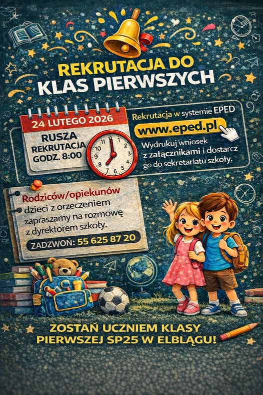 Rekrutacja do oddziału przedszkolnego oraz do klas pierwszych w Szkole Podstawowej nr 25 w Elblągu rozpoczyna się 24 lutego 2026 r. o godz. 8:00. Wniosek można złożyć online za pośrednictwem strony www.eped.pl. Dodatkowe informacje dostępne są pod numerem telefonu 55 625 87 20.