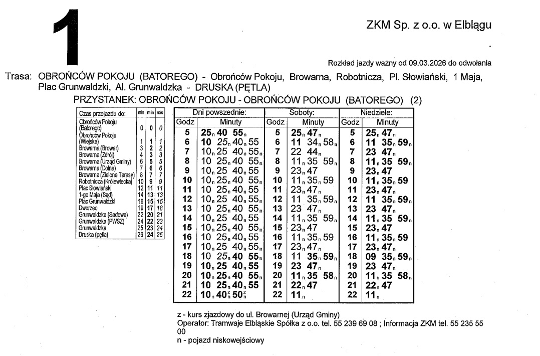 Rozkład jazdy dla linii nr 1