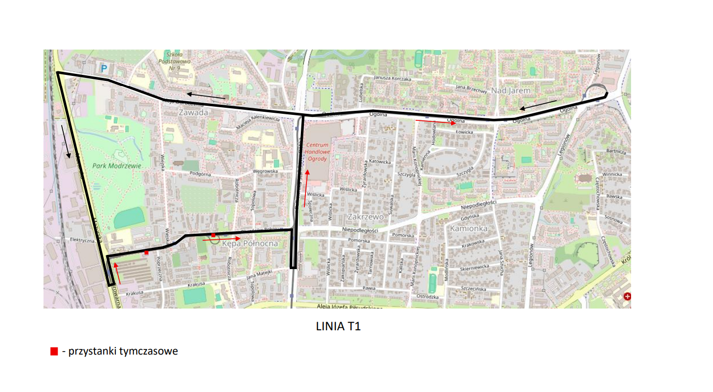 T1 po trasie: Ogólna – Odrodzenia – Mazurska – Browarna – Obrońców Pokoju – płk. Dąbka – Ogólna. W ciągu ul. Obrońców Pokoju przy skrzyżowaniu z ul. Poprzeczną i Batorego zostaną ustawione przystanki tymczasowe dla linii T1.
