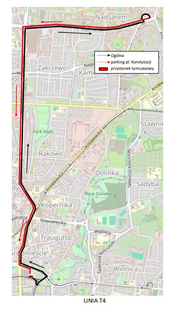 T4 po trasie: Ogólna – płk. Dąbka – 12 Lutego – Plac Konstytucji. Na parkingu przy Pl. Konstytucji (okolice przystanku tramwajowego na ul. 1 Maja) zostanie utworzony tymczasowy przystanek autobusowy dla linii zastępczej T4.