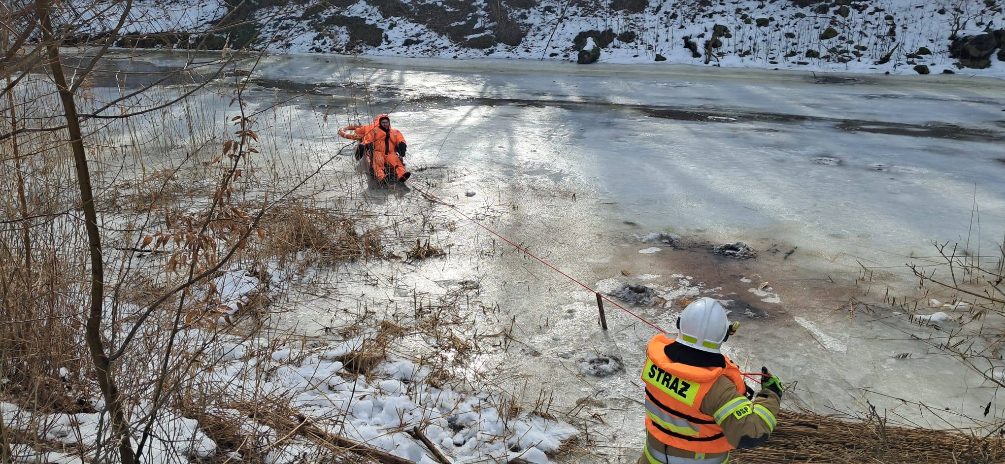 44 letni mężczyzna został ewakuowany przez strażaków z wody na sanie lodowe i dostarczony bezpiecznie do brzegu.