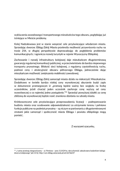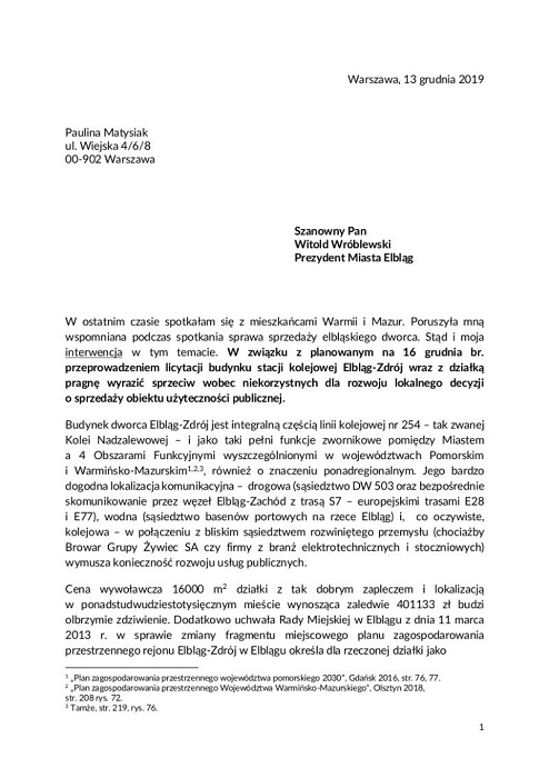 -"W ostatnim czasie spotkałam się z mieszkańcami Warmii i Mazur. Poruszyła mną wspomniana podczas spotkania sprawa sprzedaży elbląskiego dworca. Stąd i moja interwencja w tym temacie. W związku z planowanym na 16 grudnia br. przeprowadzeniem licytacji budynku stacji kolejowej Elbląg-Zdrój wraz z działką pragnę wyrazić sprzeciw wobec niekorzystnych dla rozwoju lokalnego decyzji o sprzedaży obiektu użyteczności publicznej. Budynek dworca Elbląg-Zdrój jest integralną częścią linii kolejowej nr 254 – tak zwanej Kolei Nadzalewowej – i jako taki pełni funkcje zwornikowe pomiędzy Miastem a 4 Obszarami Funkcyjnymi wyszczególnionymi w województwach Pomorskim i Warmińsko-Mazurskim1,2,3 , również o znaczeniu ponadregionalnym. Jego bardzo dogodna lokalizacja komunikacyjna – drogowa (sąsiedztwo DW 503 oraz bezpośrednie skomunikowanie przez węzeł Elbląg-Zachód z trasą S7 – europejskimi trasami E28 i E77), wodna (sąsiedztwo basenów portowych na rzece Elbląg) i, co oczywiste, kolejowa – w połączeniu z bliskim sąsiedztwem rozwiniętego przemysłu (chociażby Browar Grupy Żywiec SA czy firmy z branż elektrotechnicznych i stoczniowych) wymusza konieczność rozwoju usług publicznych.