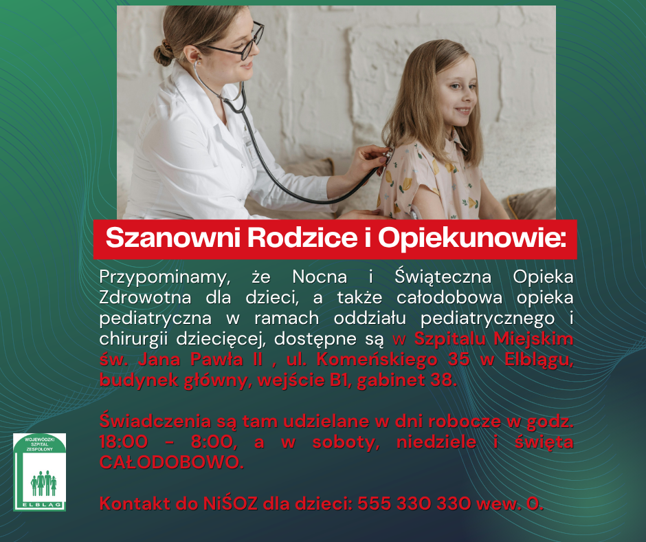 Nocna i Świąteczna Opieka Zdrowotna dla dzieci, a także całodobowa opieka pediatryczna (w ramach oddziału pediatrycznego oraz chirurgii dziecięcej), dostępne są w Szpitalu Miejskim św. Jana Pawła II w Elblągu, przy ul. Komeńskiego 35 (budynek główny, wejście B1, gabinet 38).