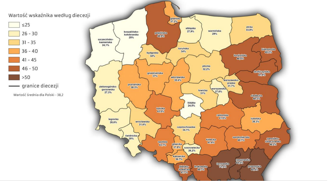 Najwyższy poziom uczestnictwa zobowiązanych katolików w niedzielnej Mszy św. odnotowano tradycyjnie w diecezji tarnowskiej (71,3 proc.), rzeszowskiej (64,3 proc.) oraz przemyskiej (60,4 proc.). Najniższy zaś procent był diecezjach szczecińsko-kamieńskiej (24,1 proc.) i łódzkiej (24,5 proc.). W diecezji elbląskiej poziom uczestnictwa w niedzielnej Mszy św. wyniósł 27,9 proc.