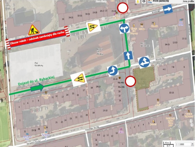 Do ul. Rybackiej dojazd będzie możliwy także przez ulicę Rzeźnicką i odcinkiem ul. Stary Rynek. Poza wymienionymi zmianami ruch w obrębie Starego Miasta odbywać się będzie zgodnie z istniejącymi zasadami. Schemat tymczasowej organizacji ruchu przedstawiony jest na załączonej mapce.