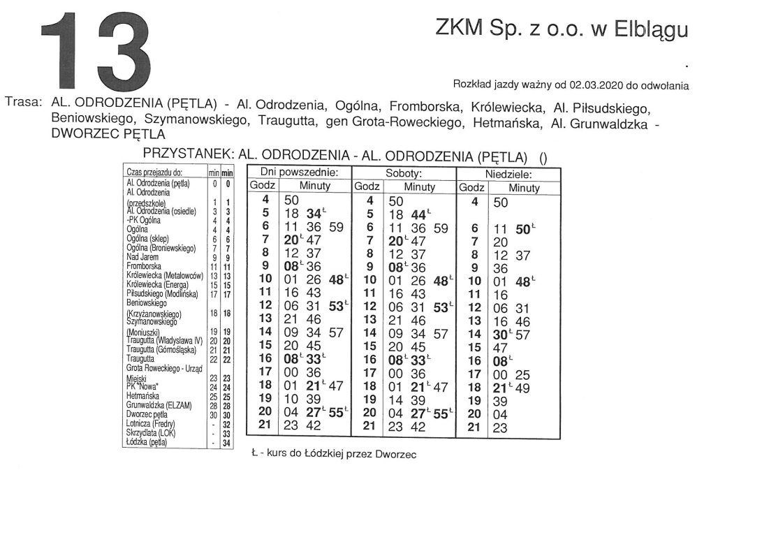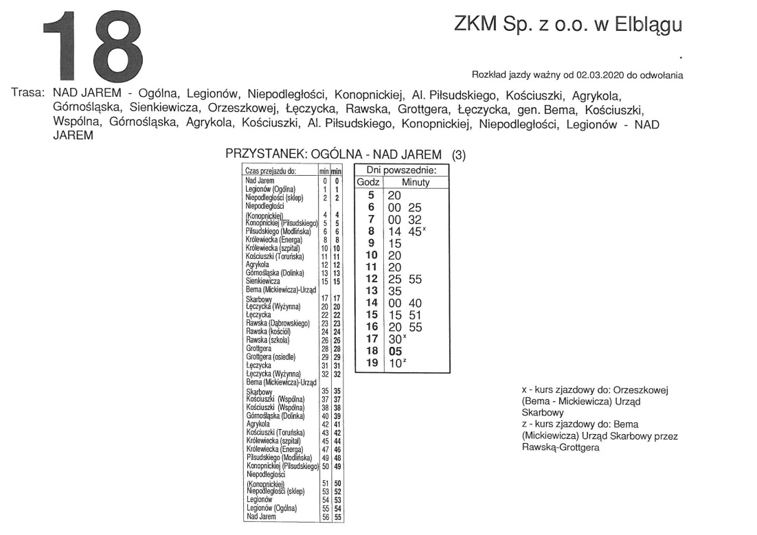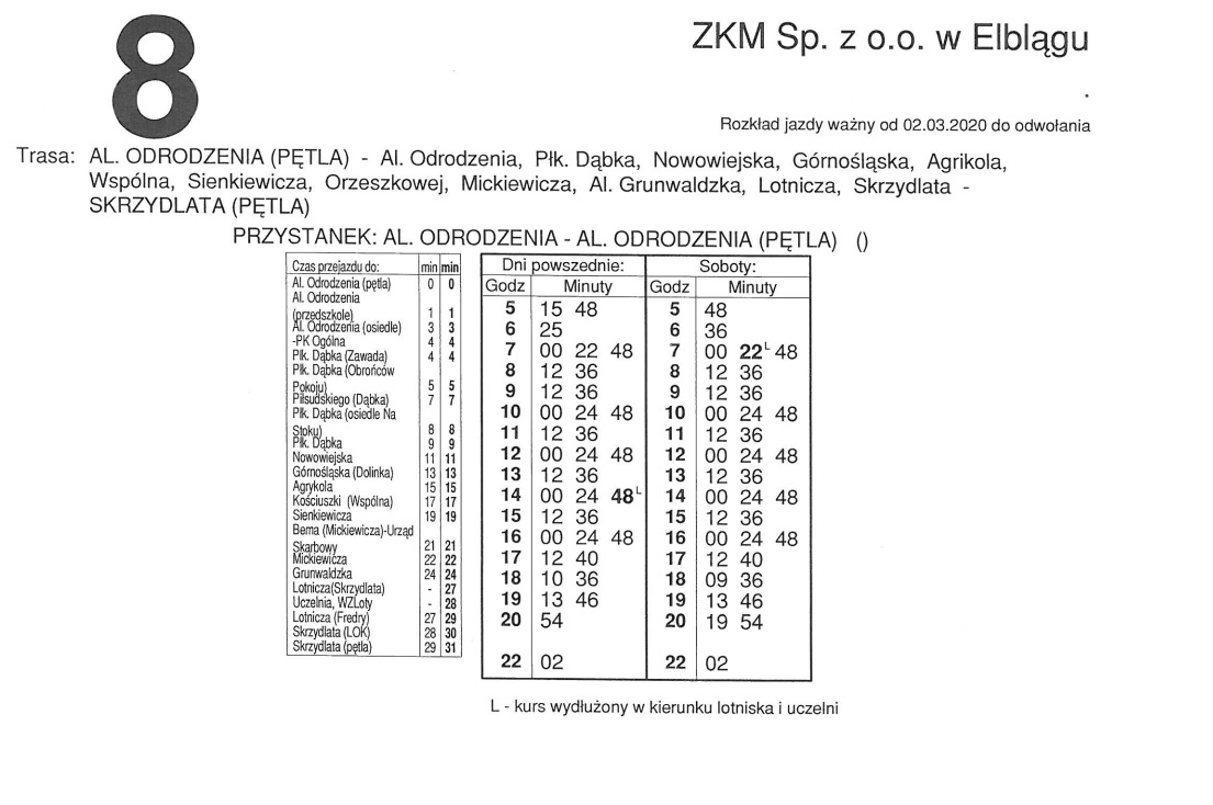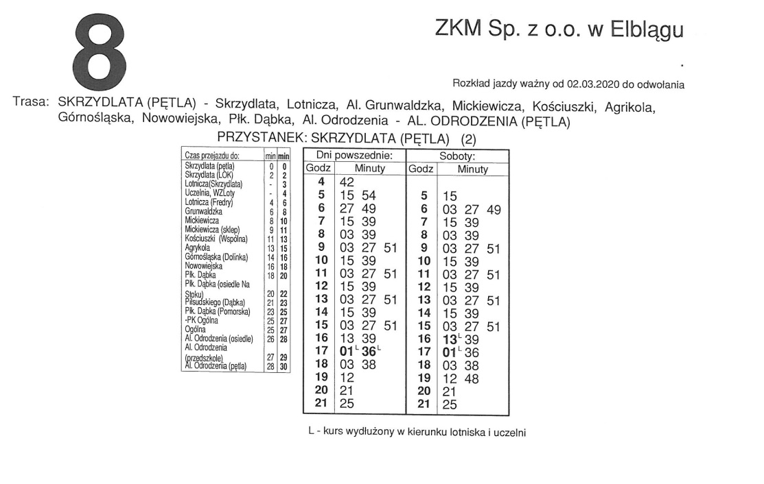 ZKM w Elblągu informuje, że od dnia 2 marca 2020 (poniedziałek) wprowadzone zostaną zmiany w rozkładach jazdy na dni robocze linii nr 8, 12, 13, 17 i 18.