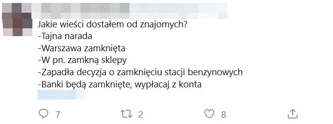 Obecnie dostrzegamy kolejne „haniebne zachowania” - głównie w mediach społecznościowych oraz za pomocą komunikatorów przekazywane są nieprawdziwe informacje dotyczące rzekomych zagrożeń, działań służb państwowych, które nie mają miejsca czy nawołujące wprost do paniki - są to niedopuszczalne i nieodpowiedzialne zachowania, nie mające żadnego oparcia w prawdzie.