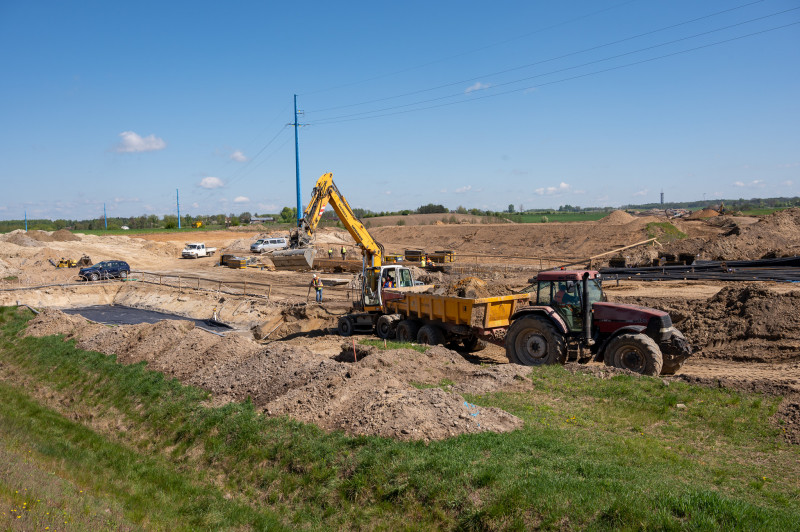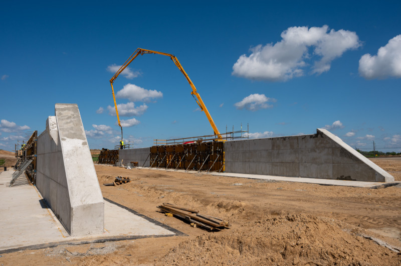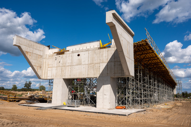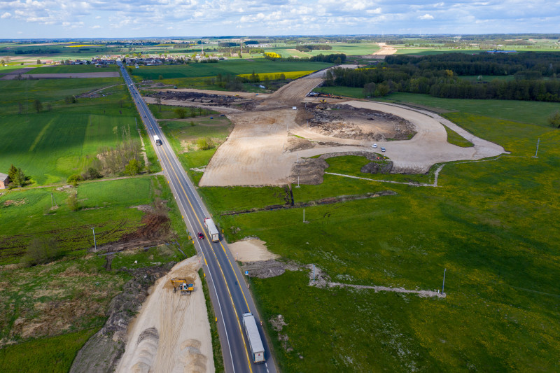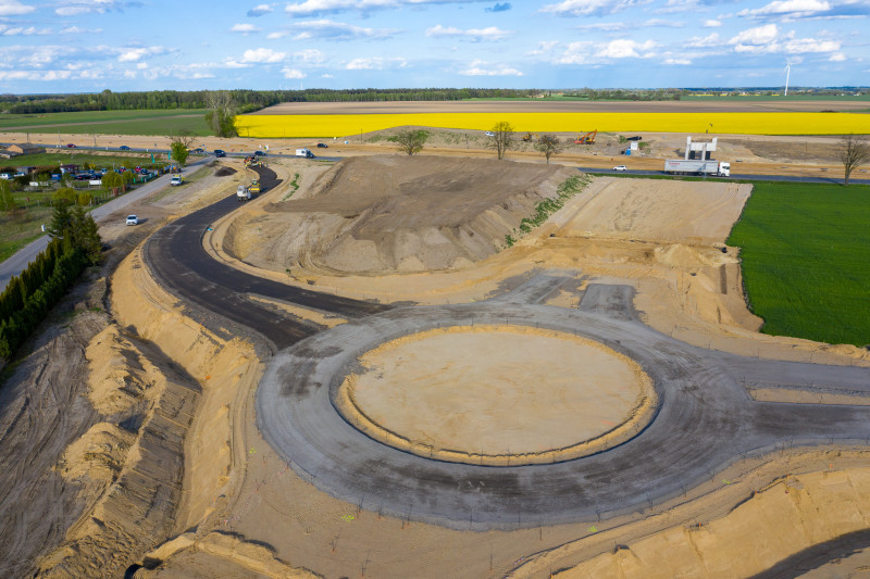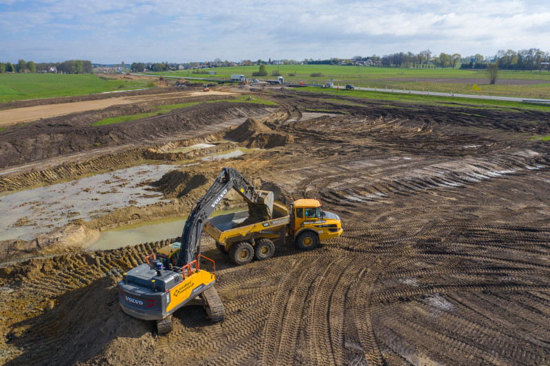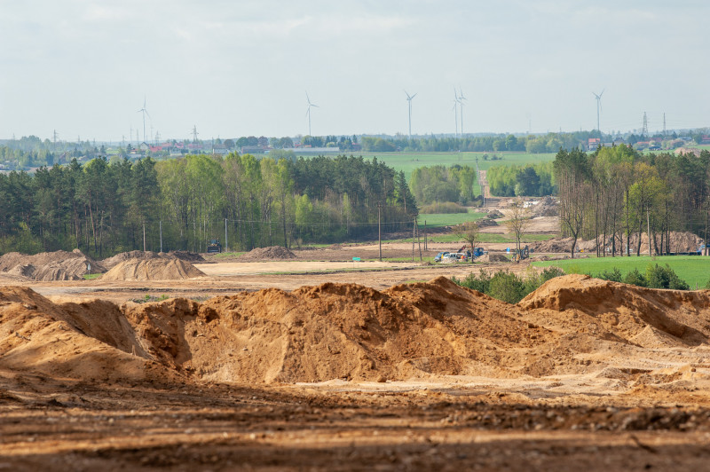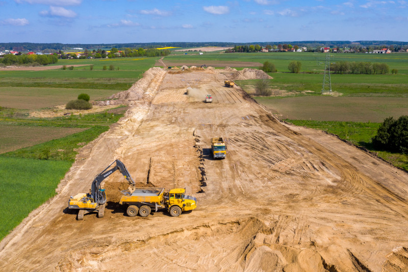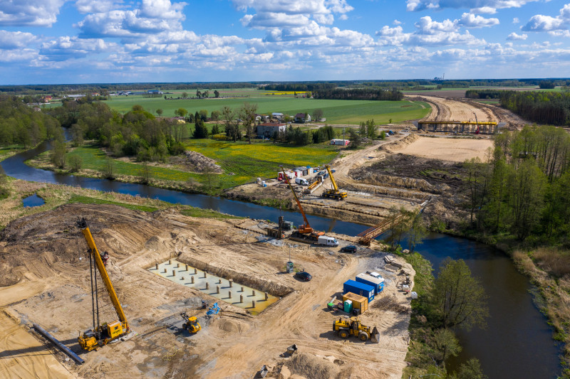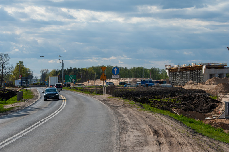 Na tym odcinku, o długości prawie 14 km, decyzję ZRID GDDKiA otrzymała w marcu br., więc tu prace budowlane dopiero ruszają. Wykonawca prowadzi teraz odhumusowanie terenu oraz karczowanie pni ściętych drzew. Rozpoczęły się prace przy wykonywaniu wykopów i nasypów. Na obiektach mostowych wykonywane były wykopy pod fundamenty, zbrojenie i betonowanie ław fundamentowych. Wykonawca prowadzi także prace sanitarne przy wykonywaniu kanalizacji deszczowej oraz roboty teletechniczne związane z usunięciem kolizji telekomunikacyjnej. Rozpoczynają się także prace archeologiczne. Zaawansowanie rzeczowe kontraktu wynosi ok. 10 proc.
