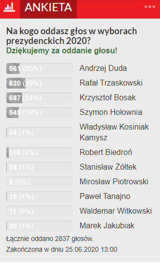 Rafał Trzaskowski zdobył 820 głosów (29%), na drugim miejscu uplasował się Krzysztof Bosak, który uzyskał 687 głosów (24%), i to jego nasi Czytelnicy chcieliby widzieć w II turze.