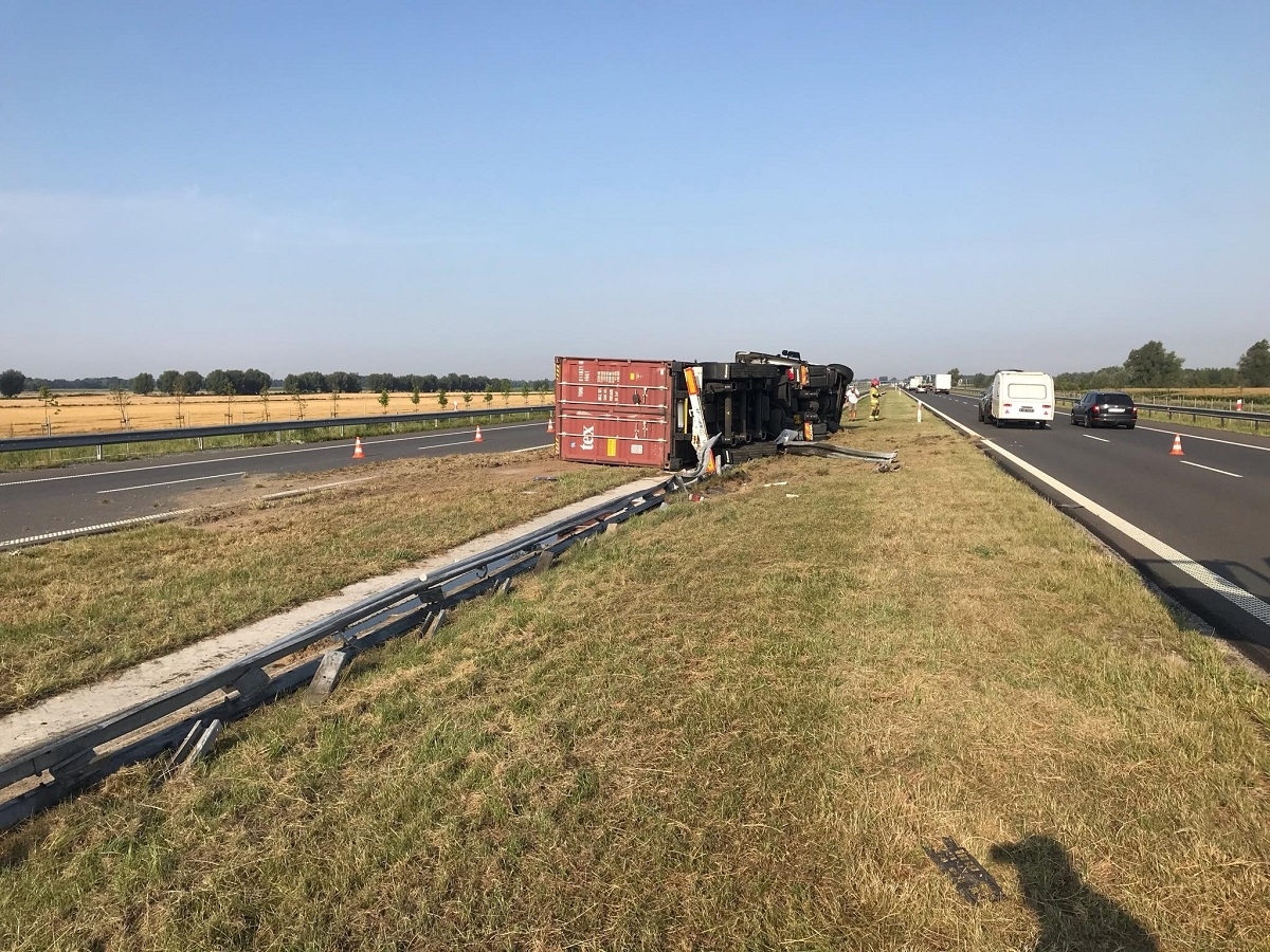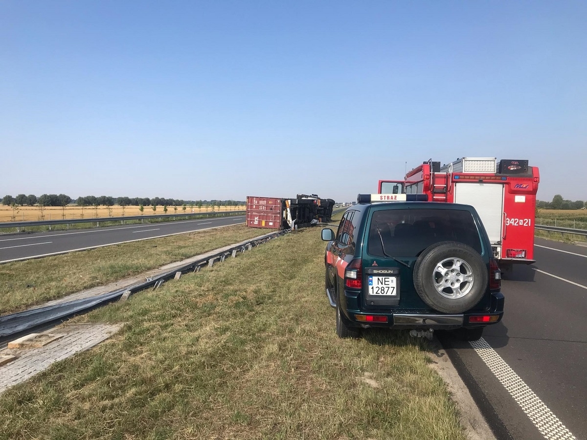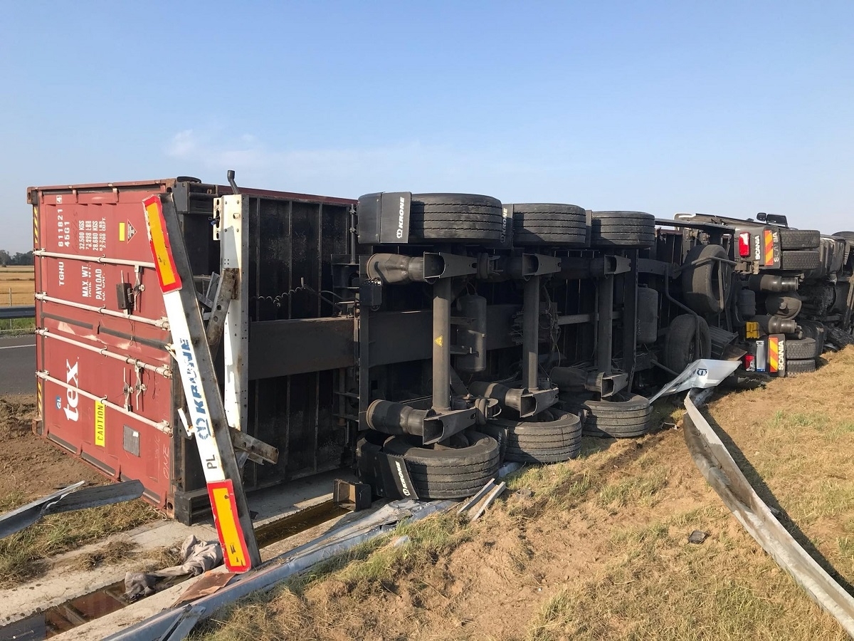 Do kolizji doszło na wysokości Adamowa, w kierunku Gdańska, jak się dowiadujemy w pojeździe ciężarowym najprawdopodobniej pękła opona, w wyniku czego kierujący stracił panowanie nad pojazdem, wjechał w barierki i przewrócił się na bok.