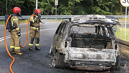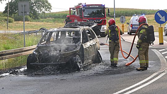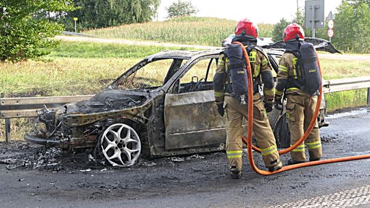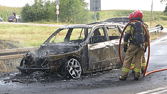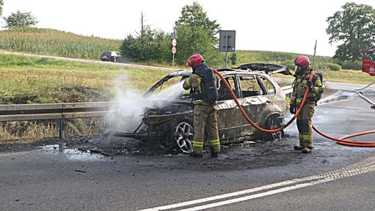 Strażacy zabezpieczyli miejsce zdarzenia oraz ugasili pożar, pojazd marki bmw spłonął w całości, na szczęście nikomu nic się nie stało, występują utrudnienia w ruchu.