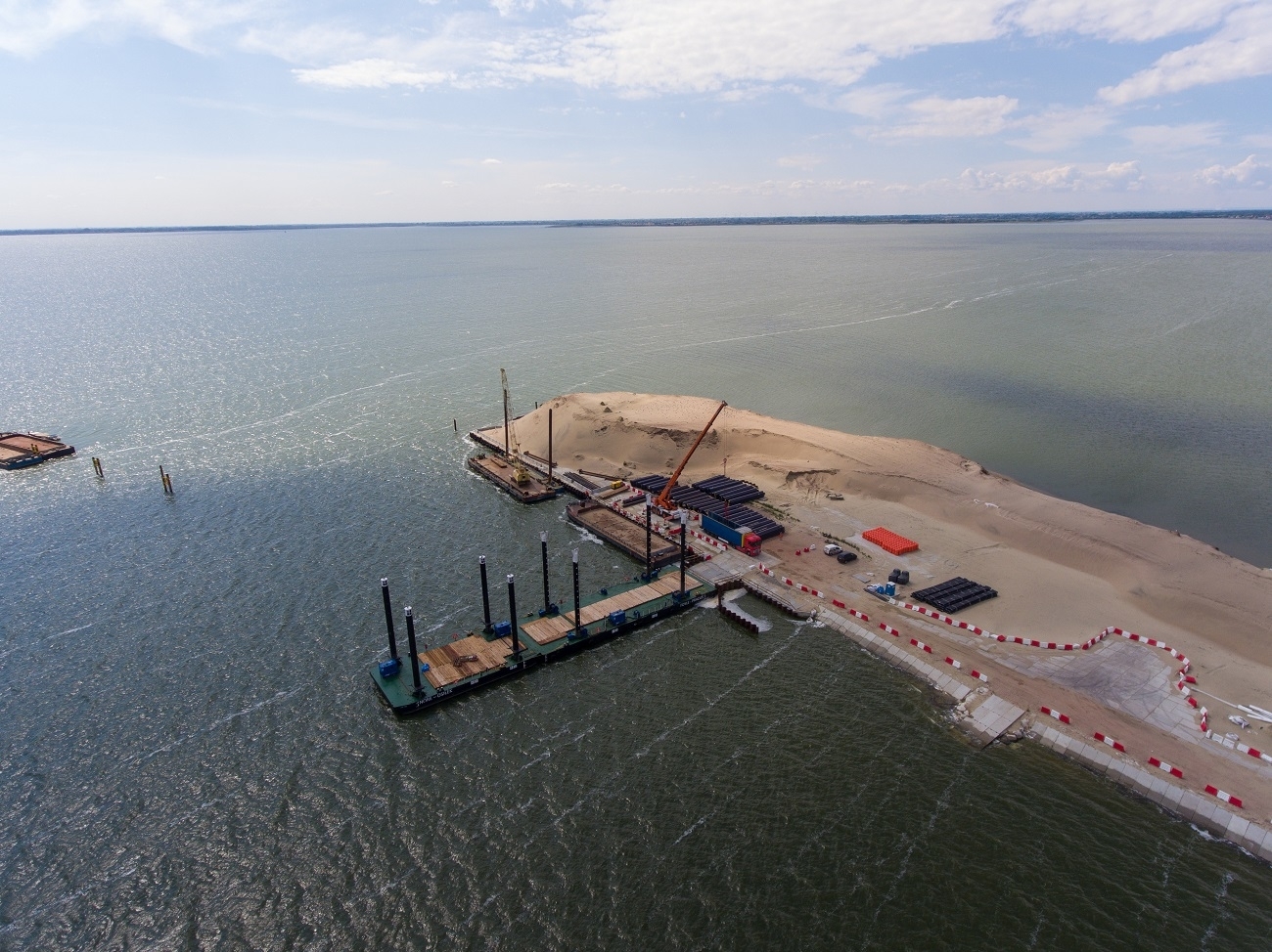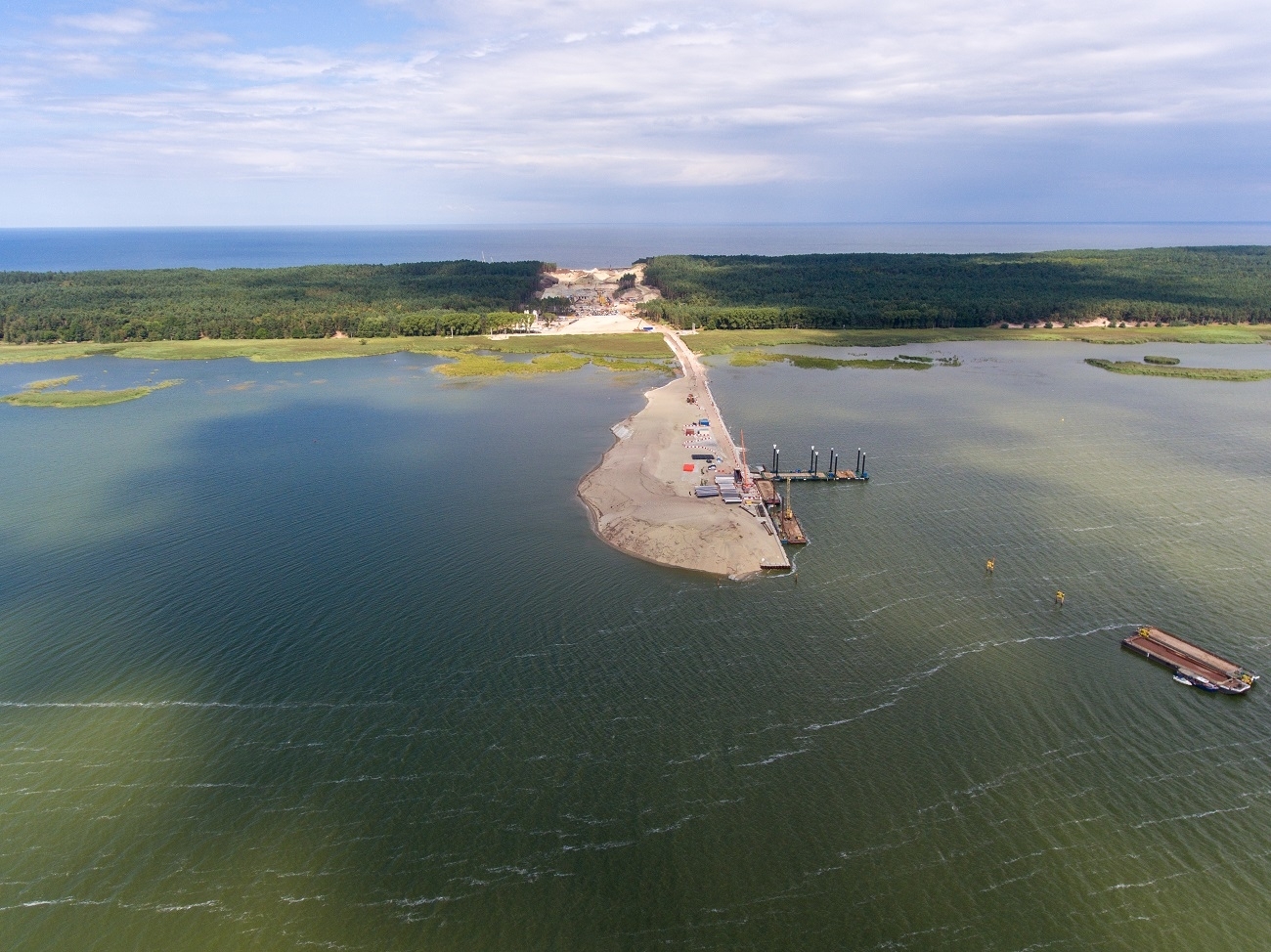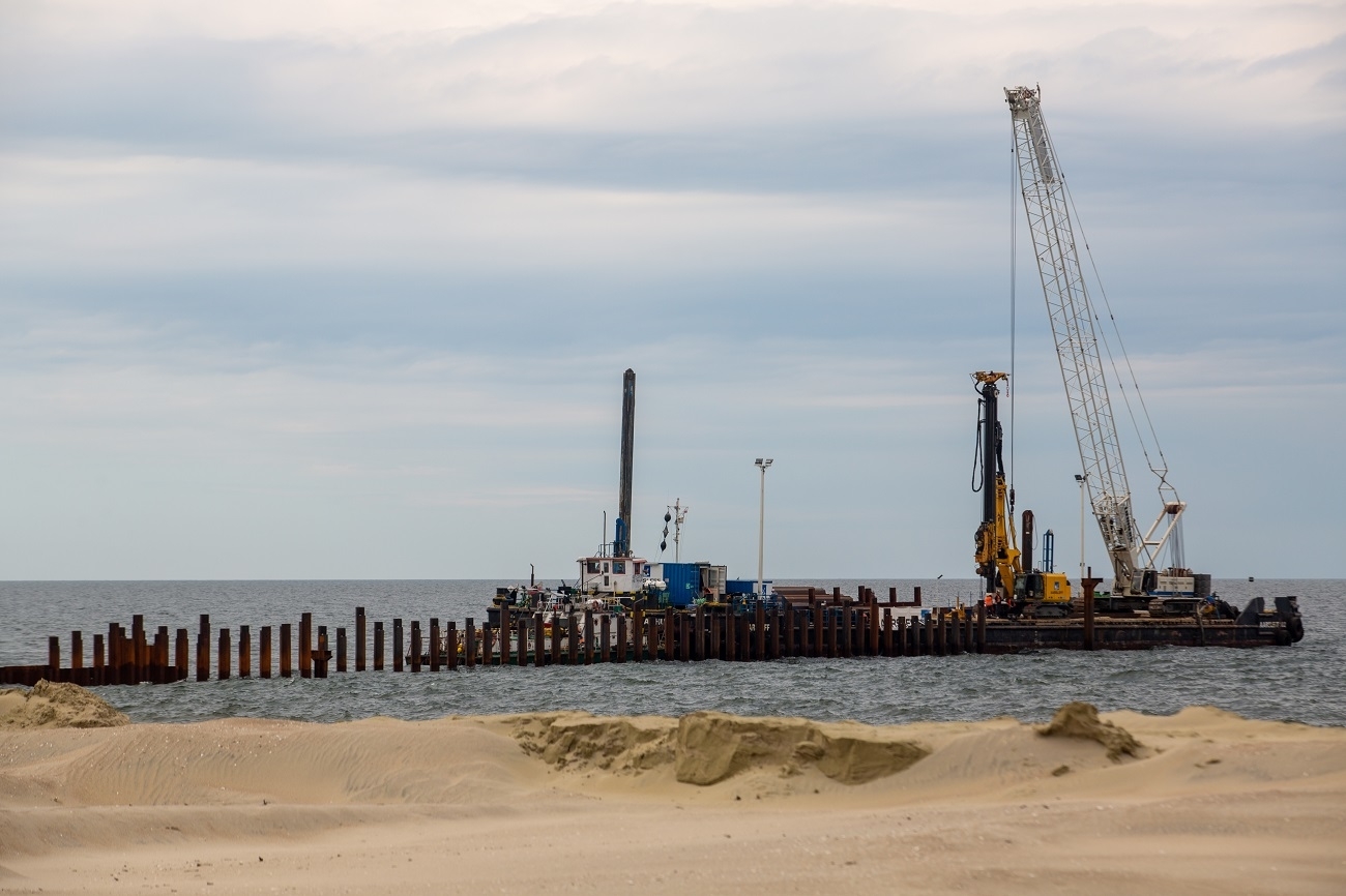 Po stronie powstającej na Zalewie Wiślanym sztucznej wyspy pogrążane są kolejne stalowe ścianki szczelne, które wyznaczają jej przyszły kształt. We wrześniu rozpocznie się montaż ściągów ścianki i roboty czerpalne.