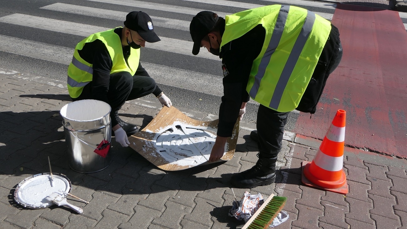 -"Dlatego policjanci z Wydziału Ruchu Drogowego KMP w Elblągu wspólnie z uczniami klas mundurowych malują piktogramy (przekreślony telefon komórkowy). Inicjatywa jest związana z bezpieczeństwem niechronionych uczestników ruchu drogowego w ramach działań ROAD SAFETY DAYS (Dni bezpieczeństwa ruchu drogowego)."