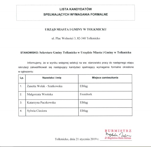 O stanowisko Sekretarza Gminy Tolkmicko ubiega się Żanetta Wolak-Szatkowska (Elbląg), Katarzyna Paczkowska (Elbląg), Sylwia Cieciora (Elbląg) oraz Małgorzata Wrońska (Frombork).