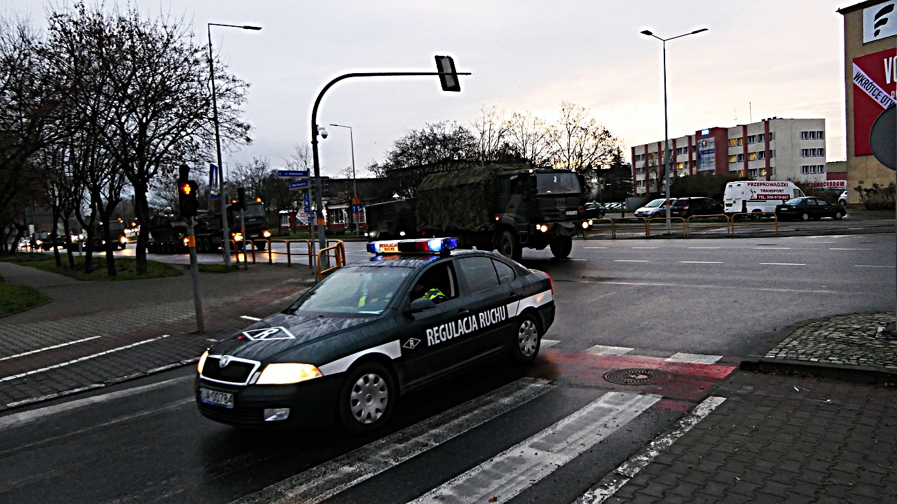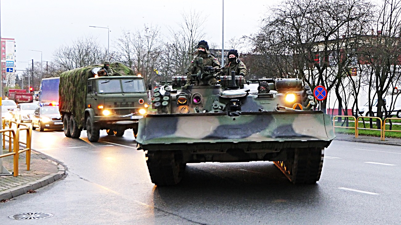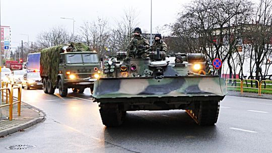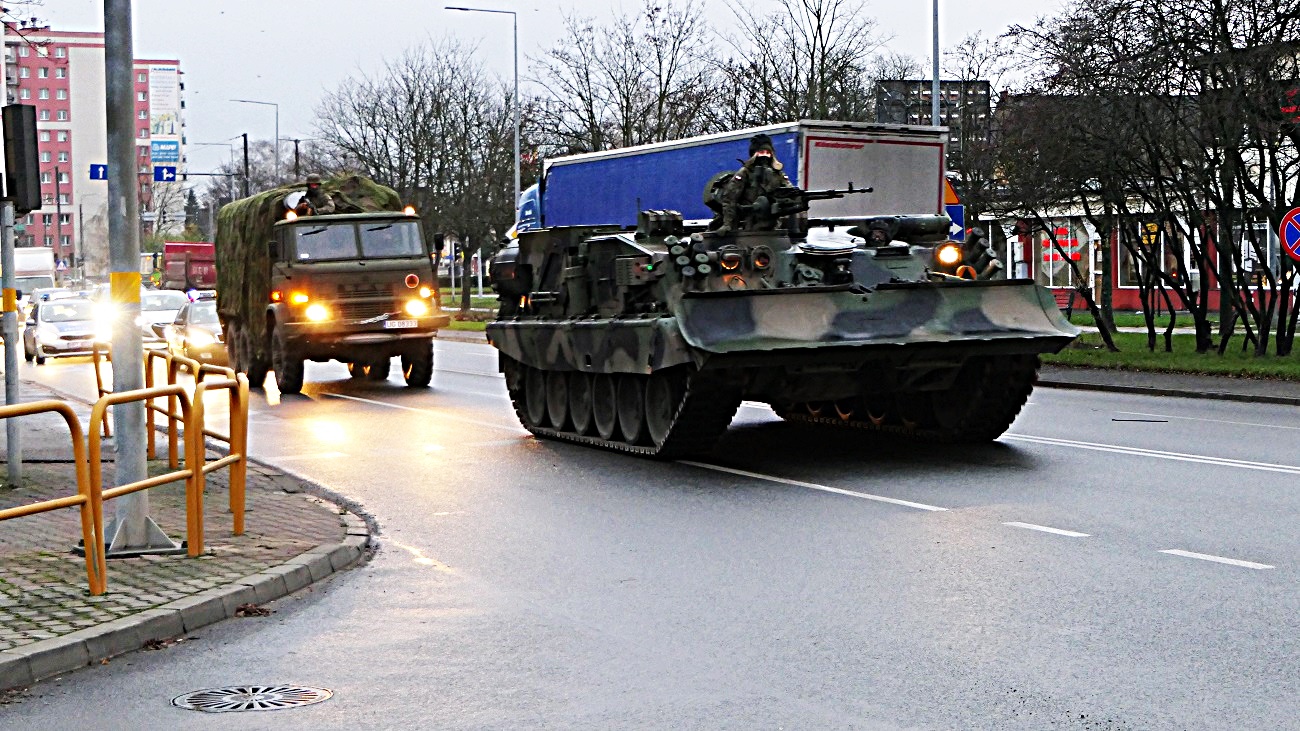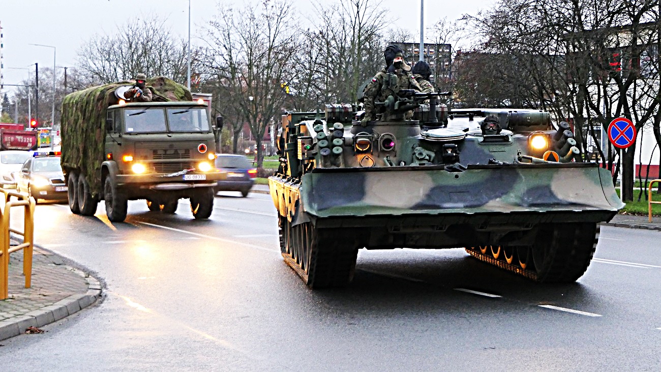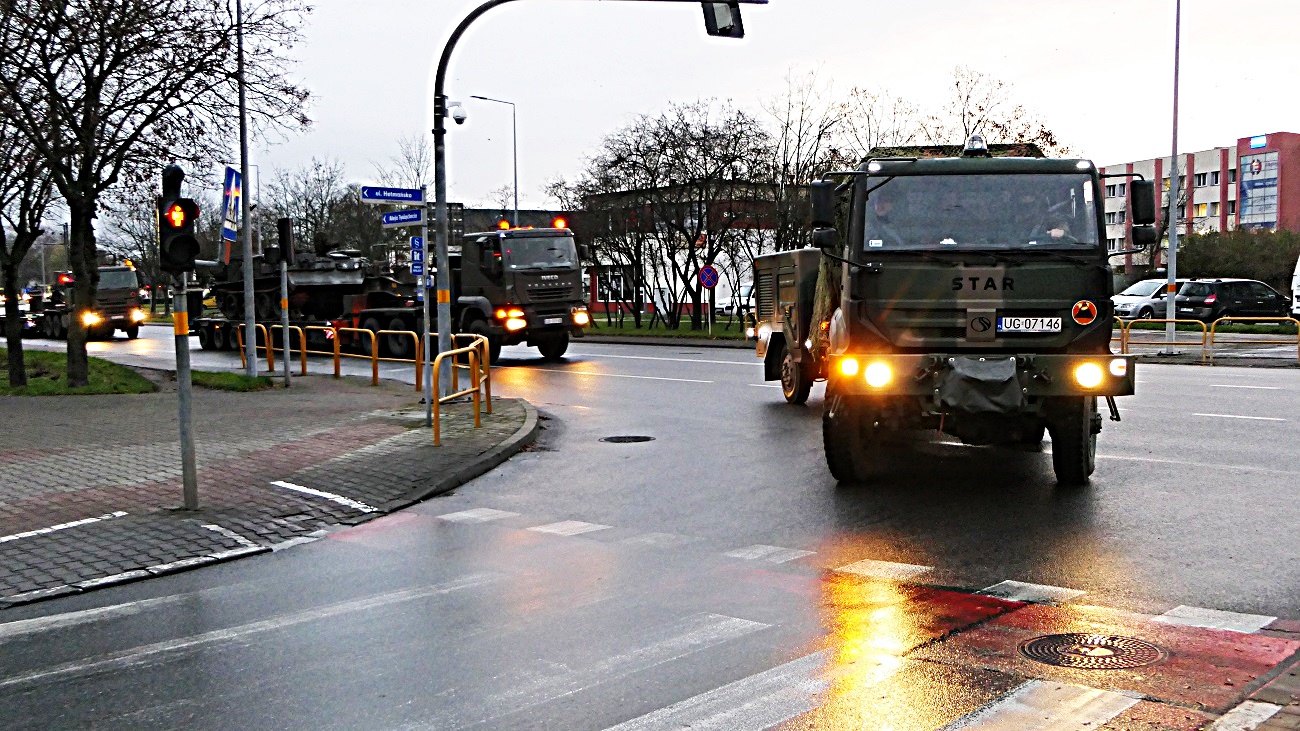 Od godziny 7 z kompleksu koszarowego przy ul. Łęczyckiej wyruszyły kolumny pojazdów wojskowych. Jedna z kolumn marszowych przemieszczała się ulicami Elbląga.