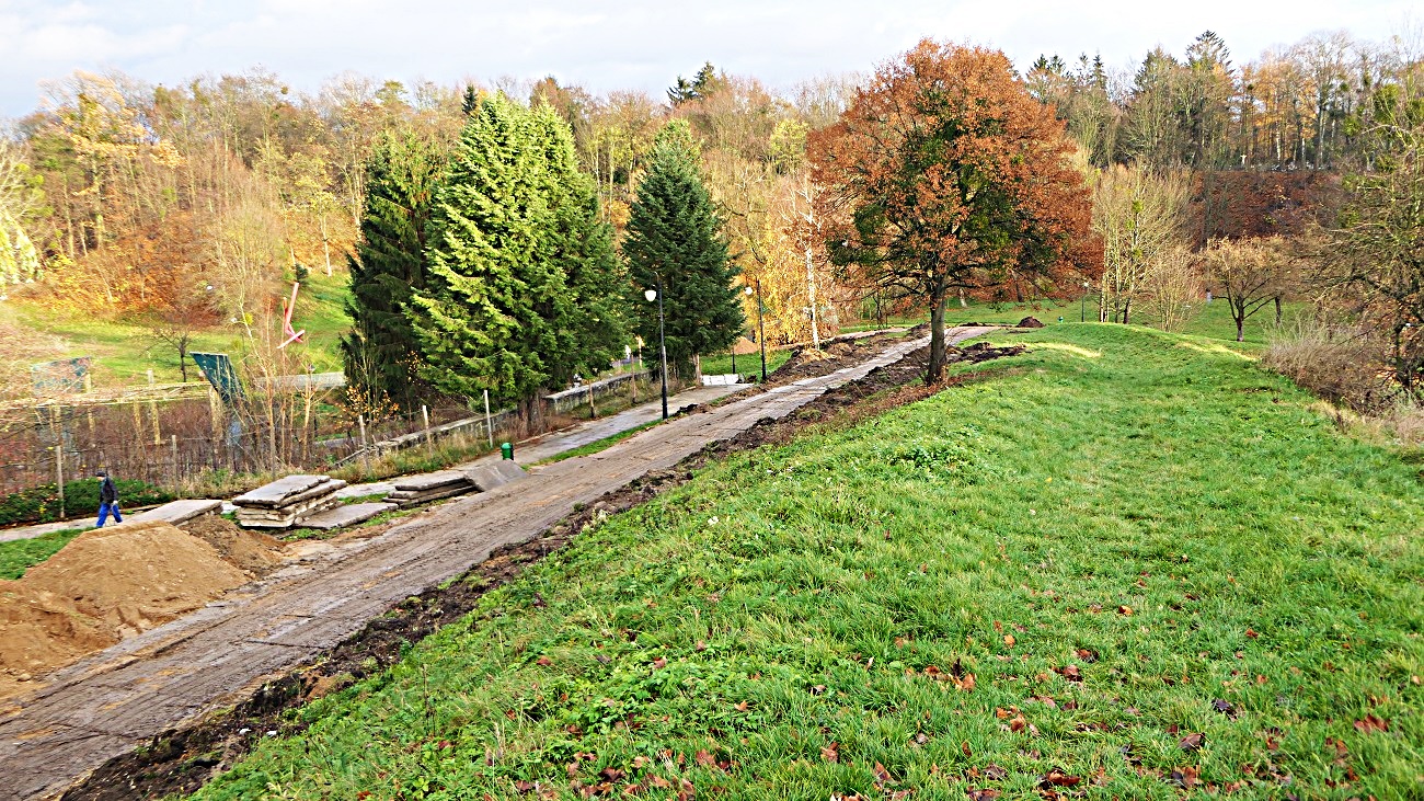 W ramach pierwszego etapu rewitalizacji zostaną wykonane nowe ciągi pieszo-rowerowe (ok. 5 480 m2) z ławkami (62 szt.) i koszami na śmieci (50 szt.), przebudowa istniejącego amfiteatru (253 miejsca siedzące, scena o średnicy 10 m, platforma schodowa dla niepełnosprawnych, zasilanie i iluminacja sceny),, budowa nowego oświetlenia (138 słupów) oraz monitoringu wizyjnego (32 kamery), remont istniejących schodów, wycinka sanitarnej części drzew i krzewów oraz wykonanie nasadzeń zieleni (2 947 m2) i trawników (555 m2) oraz regeneracja istniejących trawników (2 000 m2).