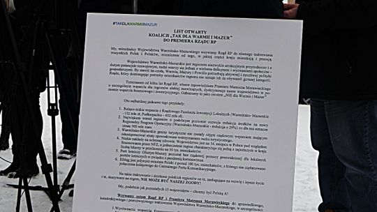 -" Mówimy NIE dla takiego traktowania, dlatego tworzymy dziś koalicję "TAK DLA WARMII i MAZUR" po to żeby sprzeciwić się takiemu traktowaniu naszego regionu. Przygotowaliśmy również list dla Premiera RP, który dziś podpiszemy, i który będzie mógł podpisać każdy mieszkaniec warmii i mazur, list ten w stosownym czasie wręczymy Premierowi RP"