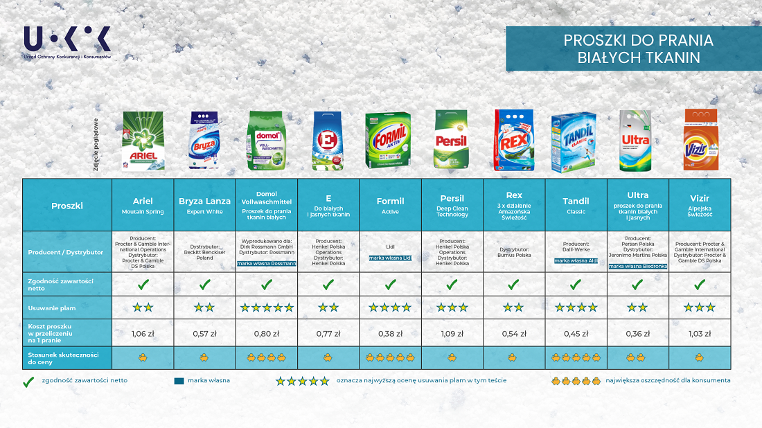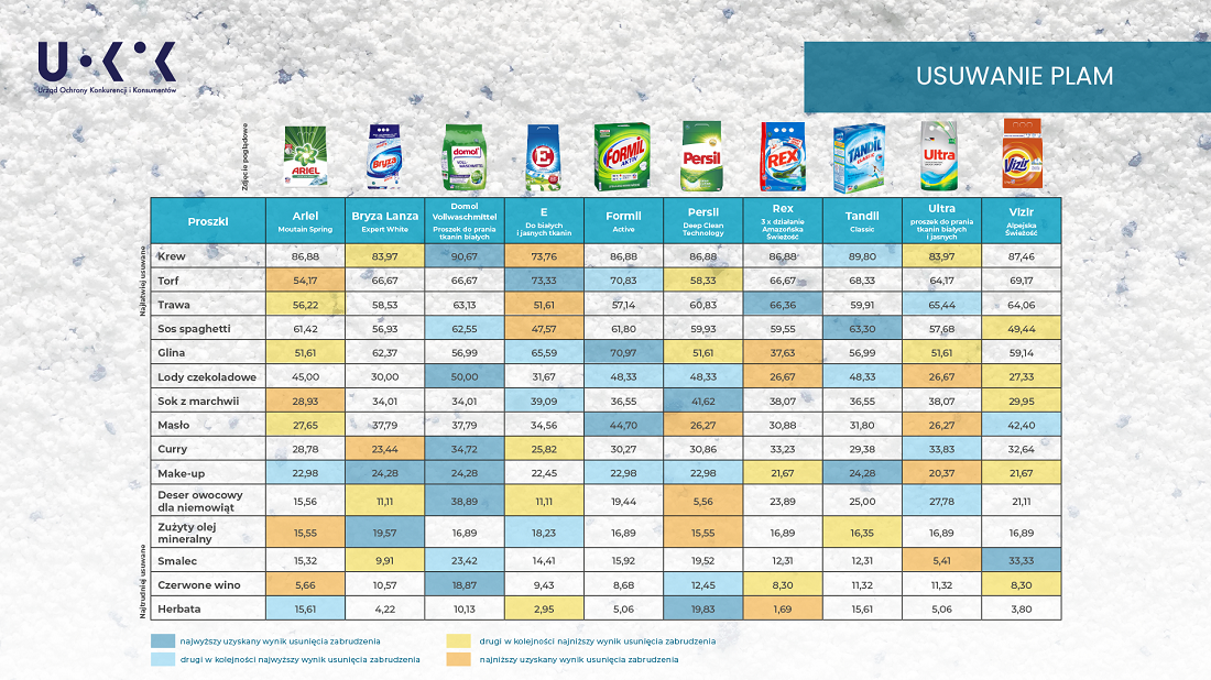 Urząd Ochrony Konkurencji i Konsumentów wziął pod lupę popularne detergenty, takie jak: Ariel, Persil, Bryzę, Rex, Vizir, Tandil, Ultra, Formil, Domol oraz E. Pracownicy laboratorium UOKiK wykorzystali gotowy materiał bawełniany z zestawem 15 najczęściej spotykanych w codziennym życiu zabrudzeń, takich jak herbata, lody czekoladowe czy sos spaghetti.