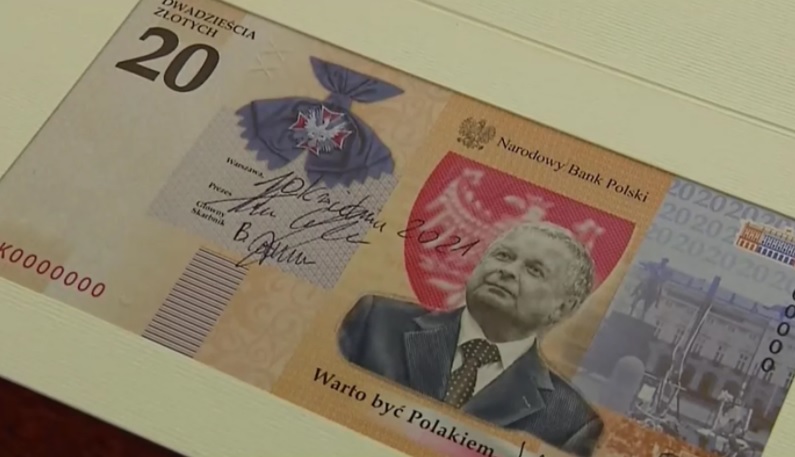 Wizerunek Lecha Kaczyńskiego zostanie wykorzystany na banknocie o nominale 20 złotych. Pod portretem byłego prezydenta Polski zostało umieczone hasło: "warto być Polakiem" z podpisem Lecha Kaczyńskiego. Również data zatwierdzenia wzoru była nieprzypadkowa, miała bowiem miejsce w dniu 11. rocznicy katastrofy smoleńskiej. Narodowy Bank Polski planuje wprowadzenie do obiegu tego banknotu z okazji Święta Niepodległości, w listopadzie bieżącego roku. Banknot trafi na rynek, a to oznacza, że będziemy mogli się nim posługiwać podczas zakupów i będzie wart tyle, ile wynosi jego nominał, czyli 20 złotych.