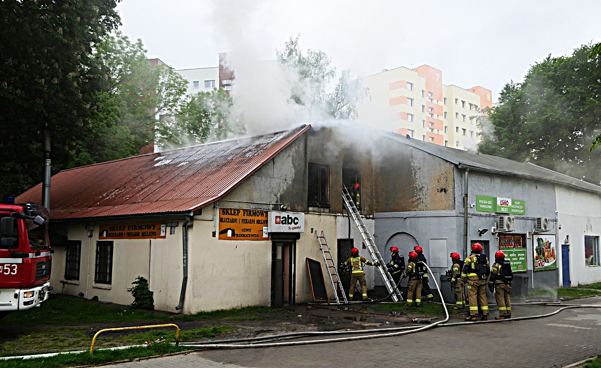 Na miejscu pracują strażacy oraz policjanci. Jak powiedział nam dowódca akcji, gdy strażacy dotarli na miejsce zdarzenia, pożarem objęty był szczyt budynku.