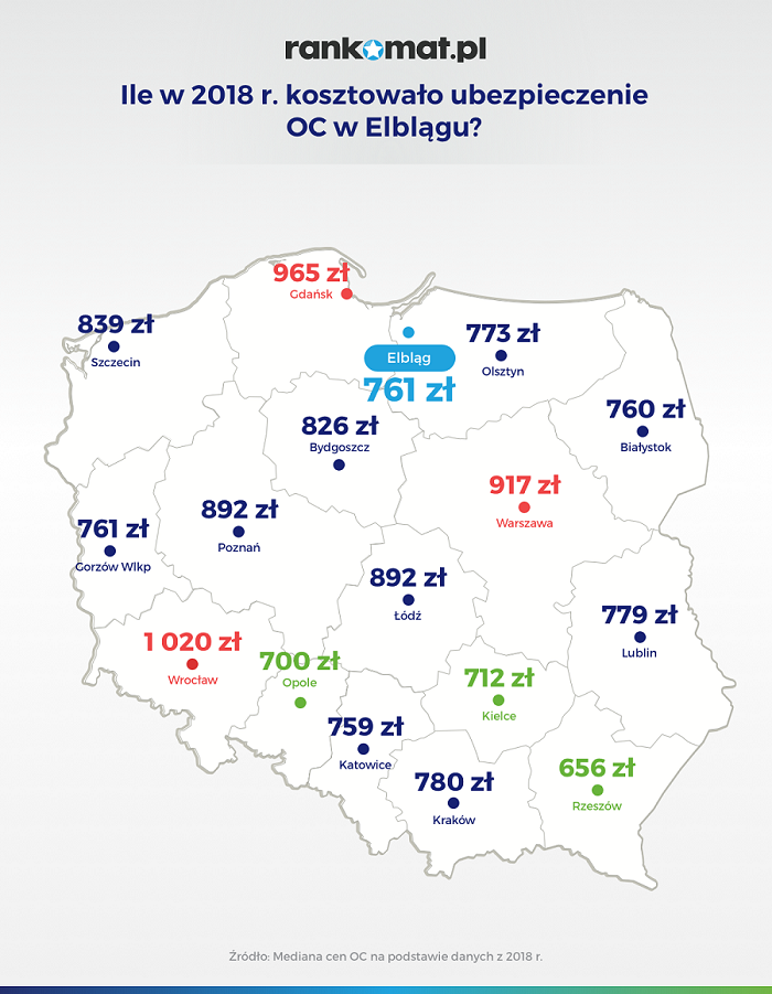 W porównaniu z rokiem poprzednim ceny OC spadły we wszystkich polskich miastach. W Elblągu średni koszt polisy był niższy o 2,3% niż rok wcześniej.