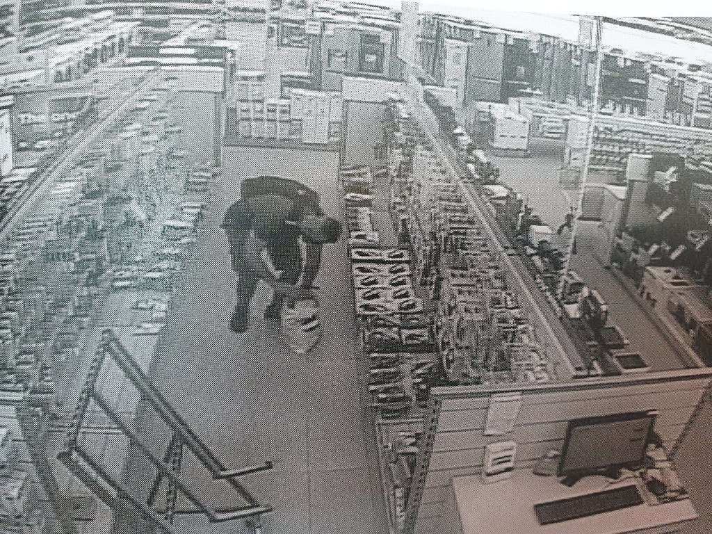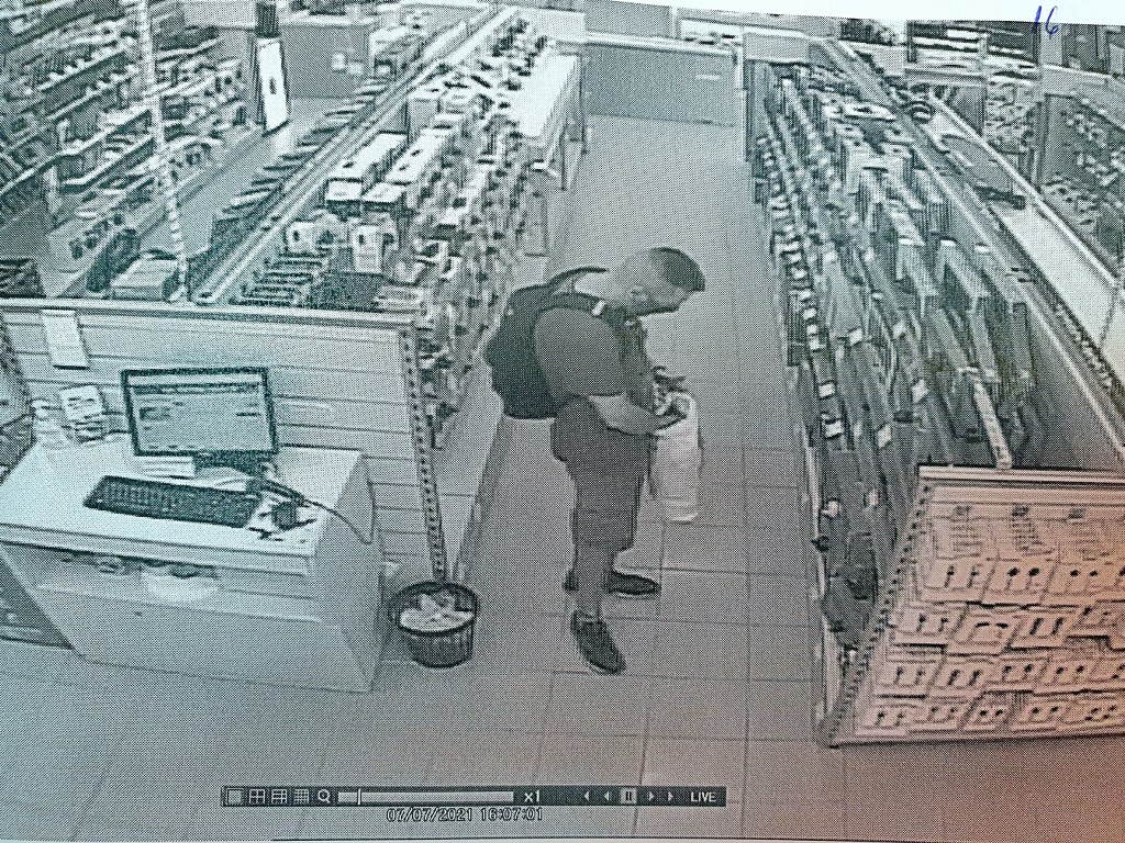 Zdarzenie zarejestrowano 7 lipca 2021 roku pomiędzy godz. 16.00 a 16.45. Na zapisie z kamer monitoringu widać jak mężczyzna zabiera ze sklepu 2 rejestratory jazdy oraz 2 pary markowych słuchawek. Wszystko o wartości blisko 3. 300 zł. Po czym wychodzi ze sklepu i nie płaci za towar.
