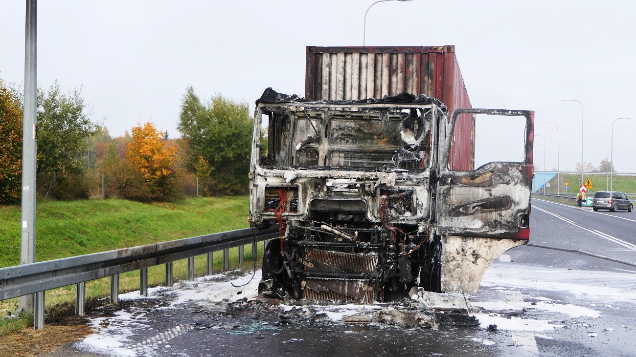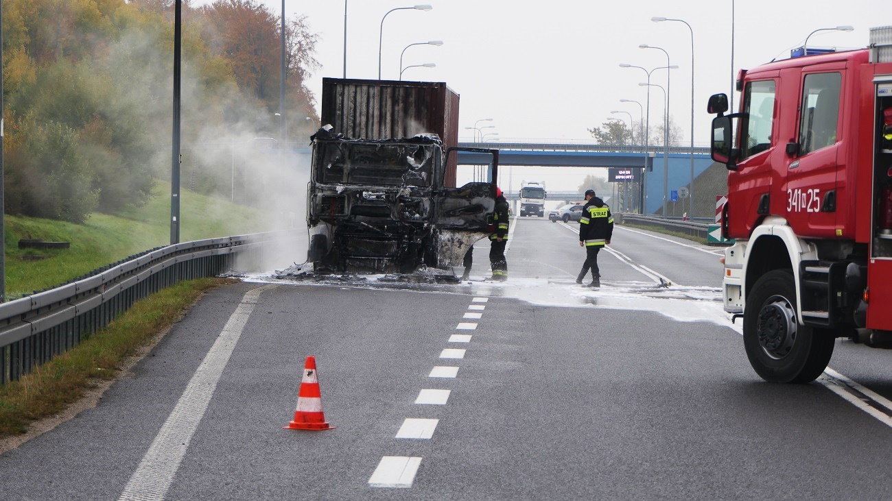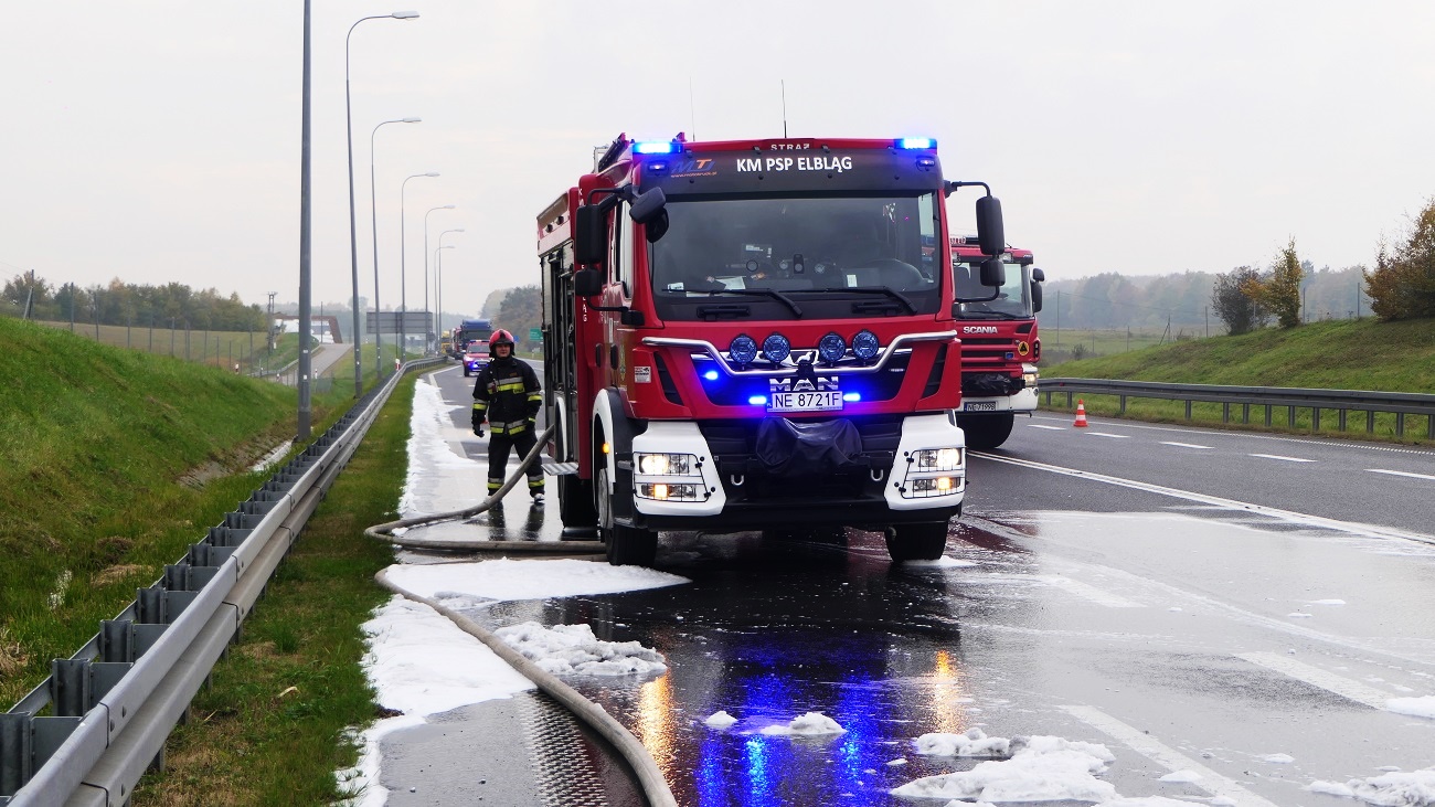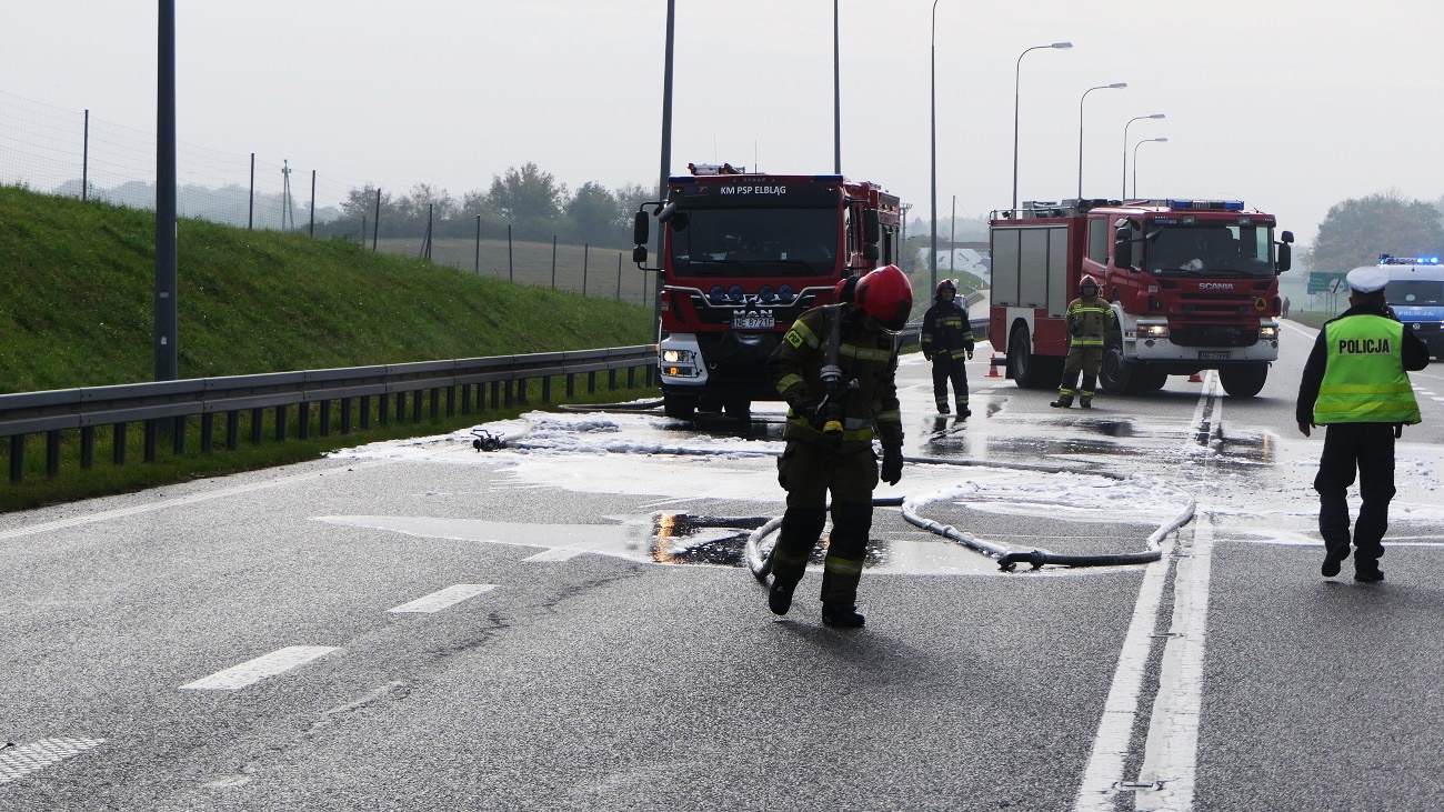 Do pożaru doszło na drodze S22 (trasa Elbląg-Braniewo) na 393 km. Na miejsce przyjechała policja i straż pożarna.