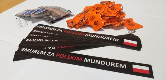 Po pierwsze jest to odblask, który mimo swoich niewielkich rozmiarów może mieć kolosalne znaczenie podczas wieczornego spaceru słabą oświetloną drogą. Po drugie to kieszonkowy kalendarzyk w formie karty, na odwrocie której policjanci przypominają o tym, jak nie paść ofiarą oszustwa. Trzeci z gadżetów to magnes na tylną klapę samochodu z napisem: #MUREM ZA POLSKIM MUNDUREM i białoczerwoną flagą. To dla tych, którzy chcą wyrazić swoje poparcie i podkreślić ważną rolę służb mundurowych podczas działań podejmowanych m.in. w rejonie wschodniej granicy.