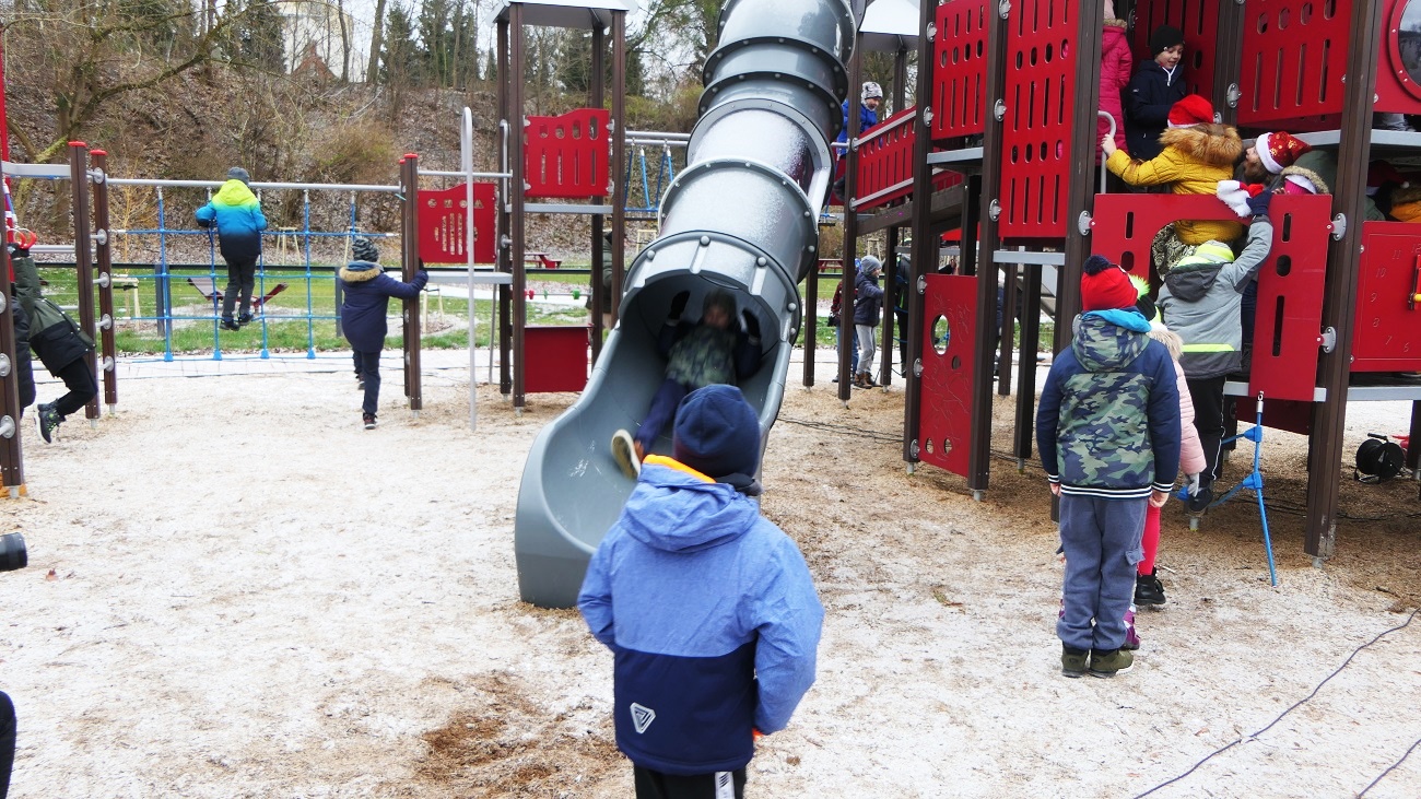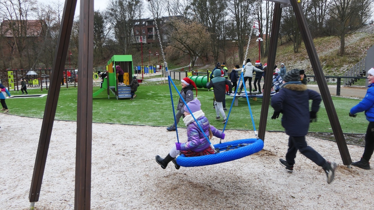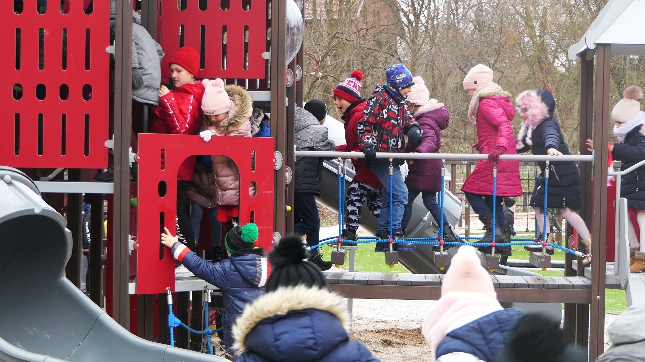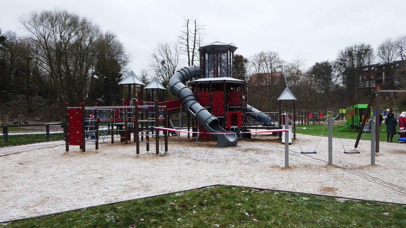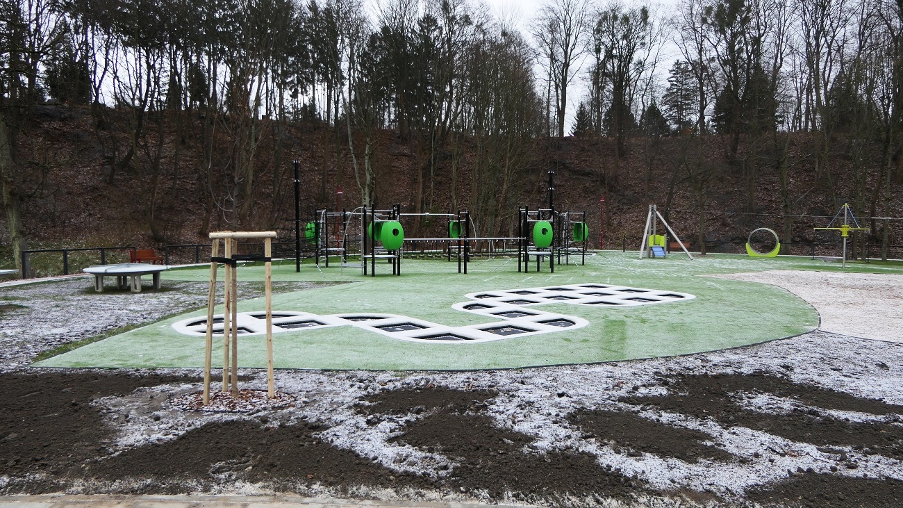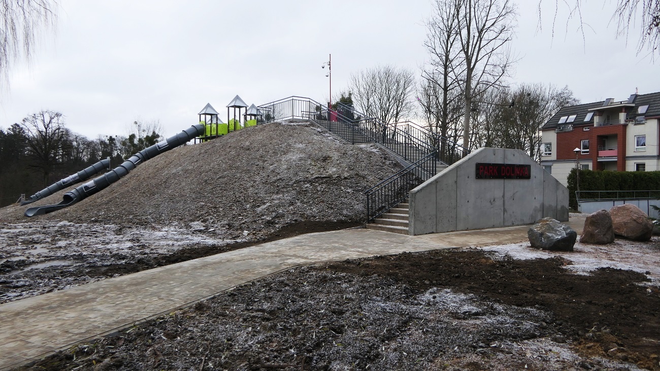 · plac zabaw „górka” – zestaw startowy z trzema zjeżdżalniami, 4 zjeżdżalnie rurowe, 2 zjazdy linowe, duży zestaw parku linowego, trapy, liny do wspinaczki i słupki do skakania, zestaw zabawowy pierzeja,