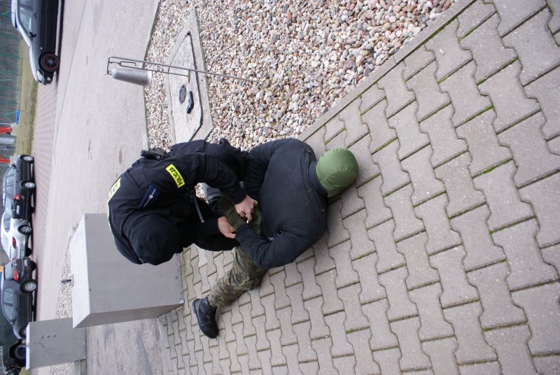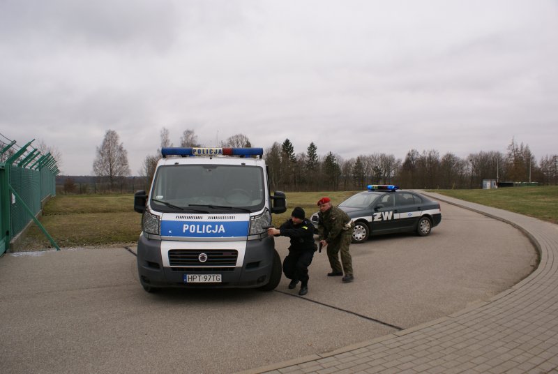 Dyżurny powiadamia strażaków, pogotowie, Powiatowe Centrum Zarządzania Kryzysowego. Wszystkie siły zostają zadysponowane w rejon jednostki wojskowej. Jeden z intruzów odjechał szarym furgonem w kierunku S-22.