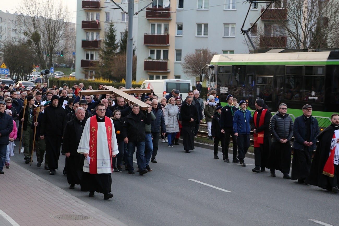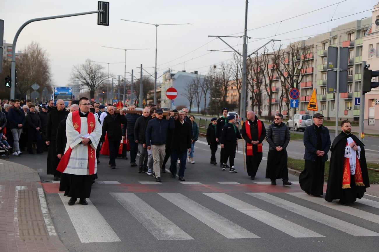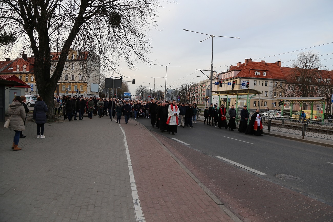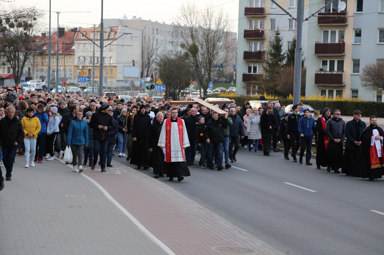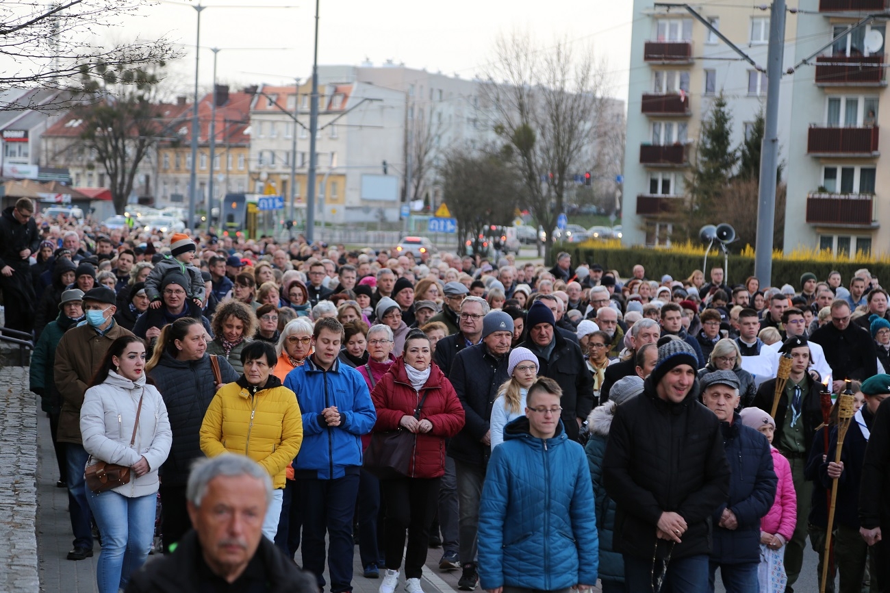 Droga Krzyżowa ruszyła o godzinie 19.00, przy kościele Matki Bożej Królowej Polski (ul. Robotnicza). Stamtąd przeszła ulicami płk. Dąbka, 12 Lutego, Hetmańską i Giermków w stronę katedry św. Mikołaja. Drogę Krzyżową zabezpieczała elbląska policja.