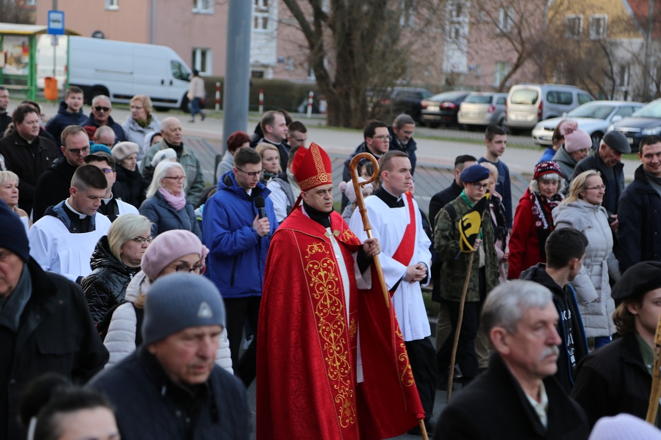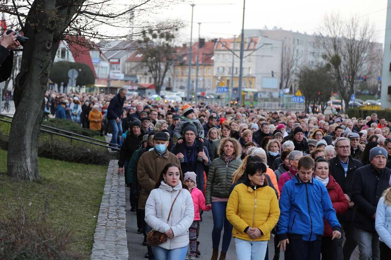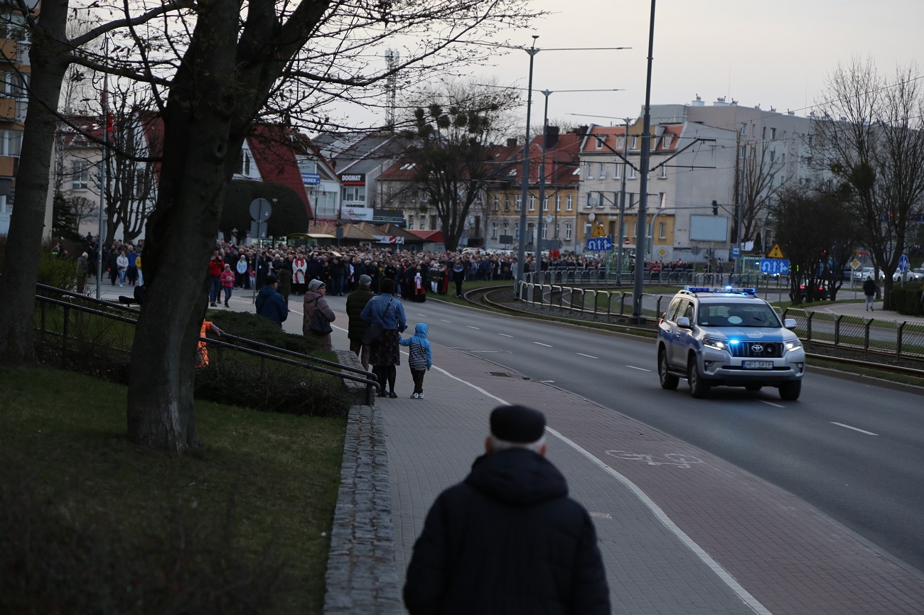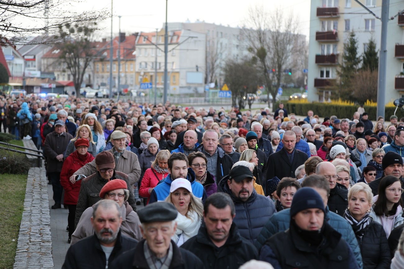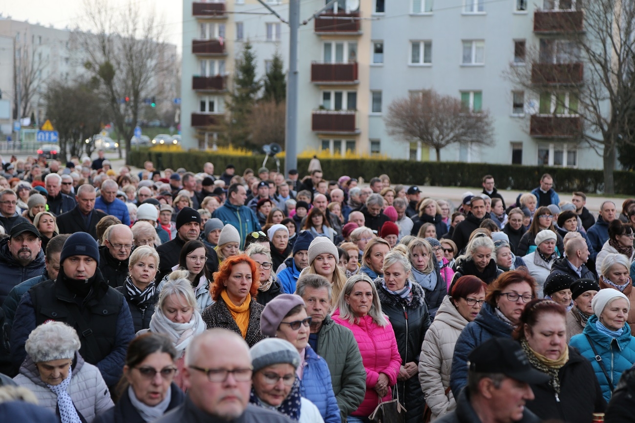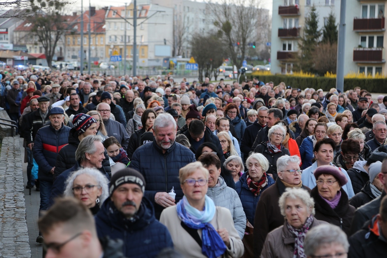 Droga Krzyżowa ruszyła o godzinie 19.00, przy kościele Matki Bożej Królowej Polski (ul. Robotnicza). Stamtąd przeszła ulicami płk. Dąbka, 12 Lutego, Hetmańską i Giermków w stronę katedry św. Mikołaja. Drogę Krzyżową zabezpieczała elbląska policja.