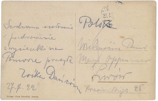 Kartka została źle zaadresowana. W księgach adresowych z 1914 i 1916 roku rodzina Oppenauer mieszkała we Lwowie na ul. Krasińskiego 23 (nie 25), w roku 1912 i 1913 zamieszkiwali natomiast na ulicy Gołąba 6.Obie panie znały się prawdopodobnie z prywatnego gimnazjum żeńskiego Zofii Strzałkowskiej.