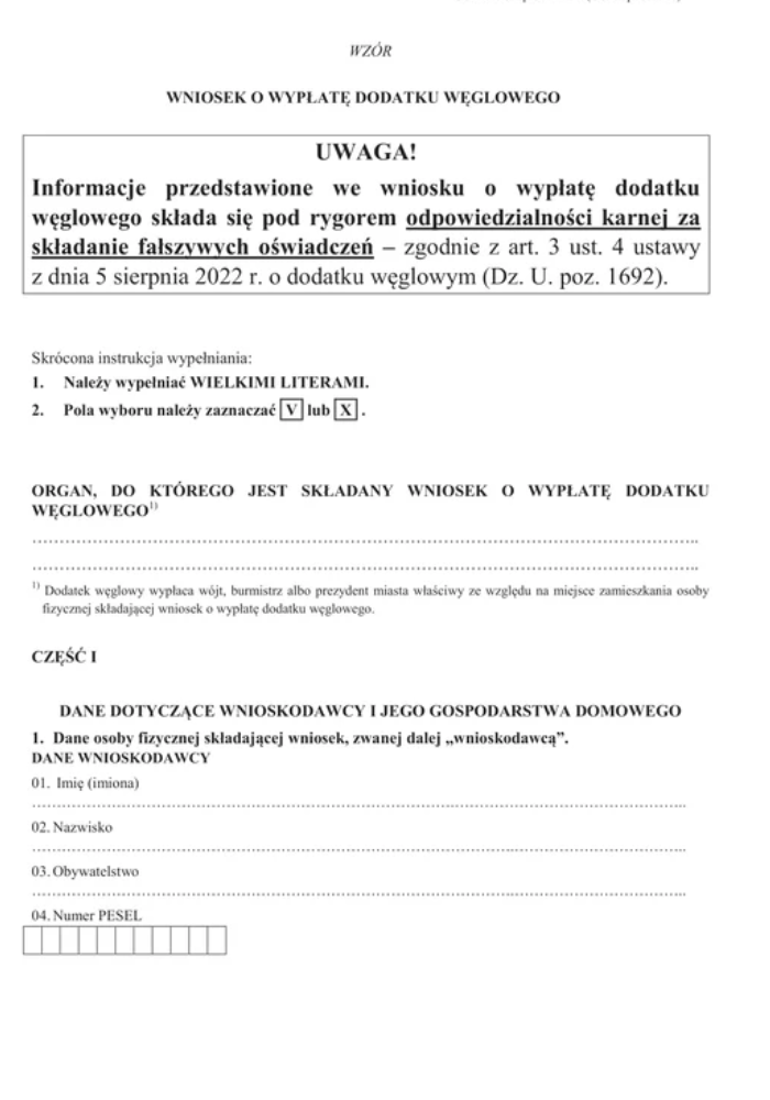 Wnioski o dodatek węglowy będzie można składać osobiście lub za pomocą poczty oraz online (np. przez e-PUAP). Wniosek ma sześć stron (wzór w galerii).