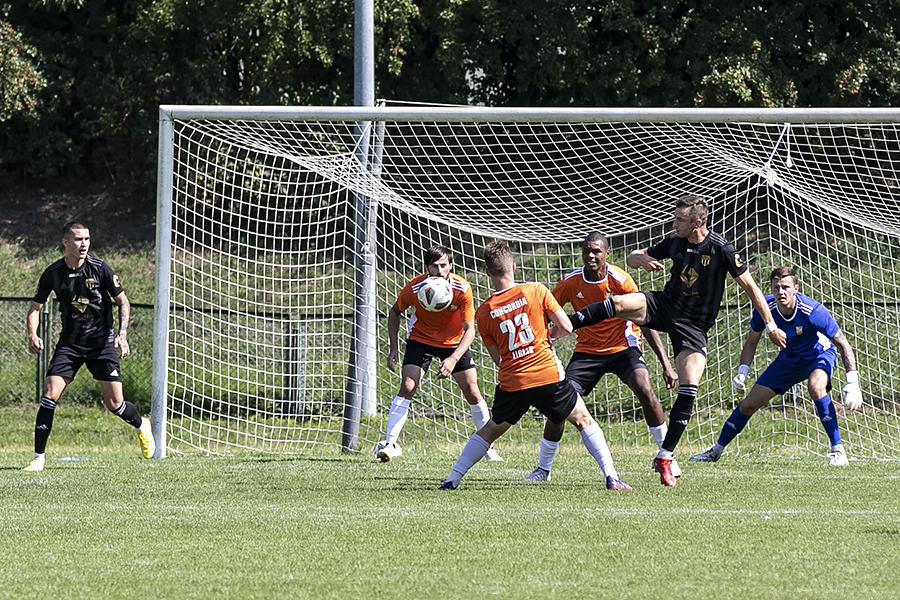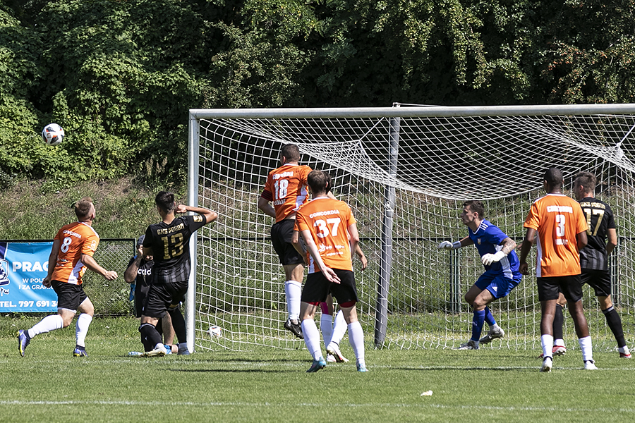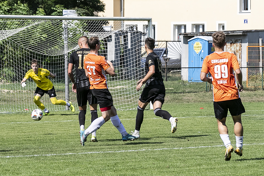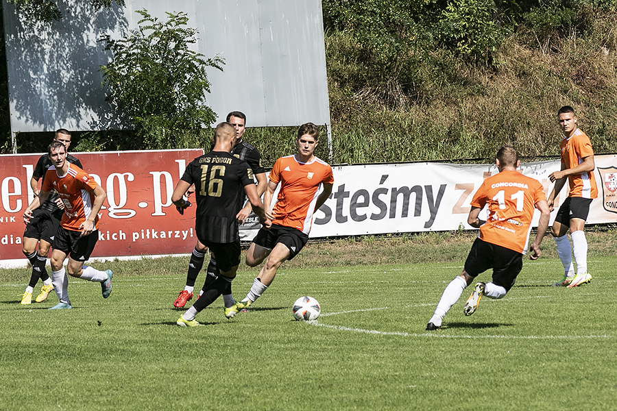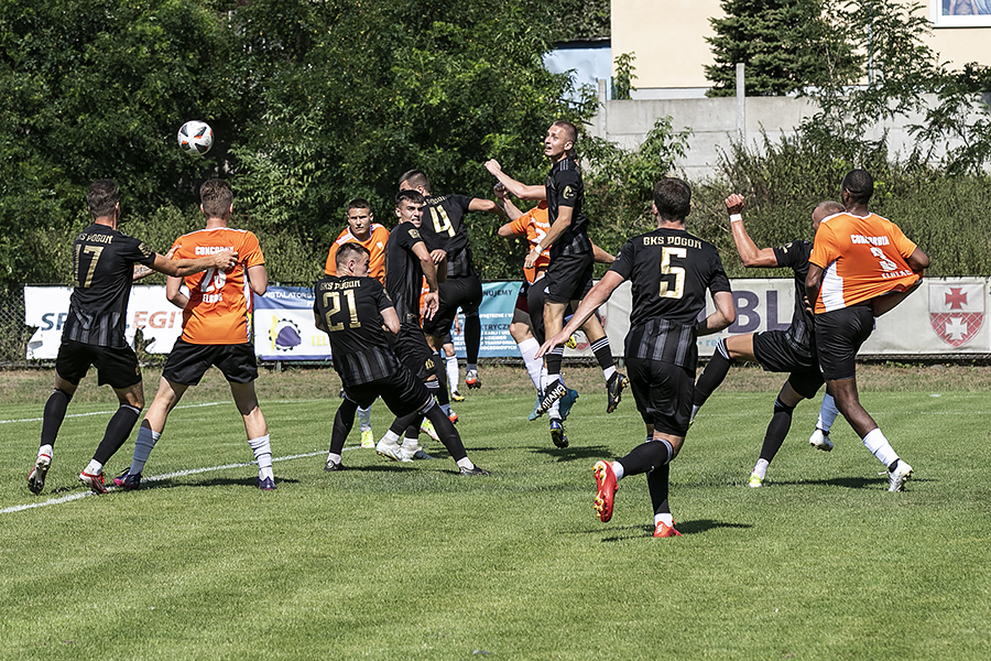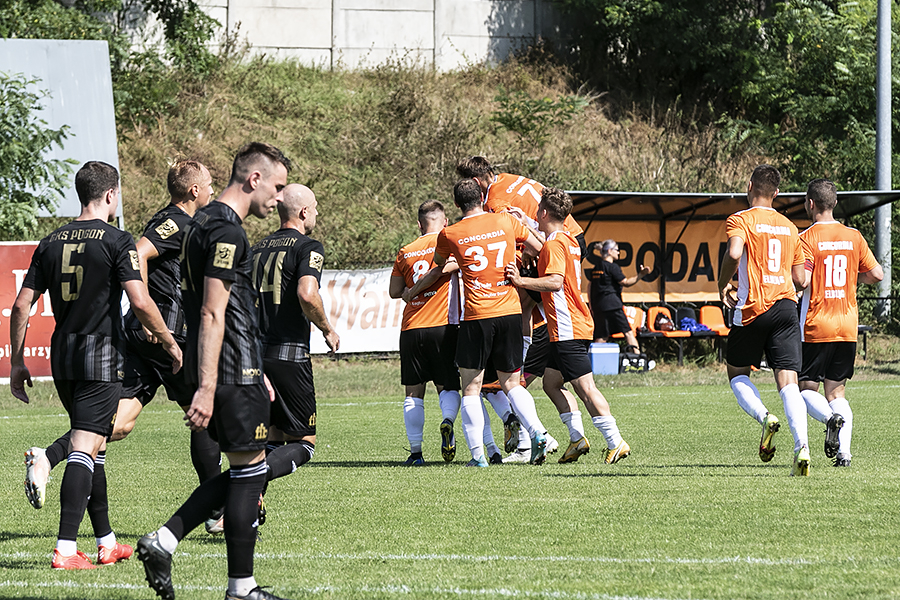 Pogoń Grodzisk Mazowiecki to zespół, który będzie się liczył w walce o awans. Dla miejscowych była to zatem drużyna wymagająca. Od początku pojedynek ten sprawiał wrażenie wyrównanego, ale po chwili przyjezdni zamienili na gola błąd w ustawieniu obrońców. Podanie ze skrzydła, piłka sunęła w 13 minucie przed bramką Concordii, a Kacper Imiołek dostawił nogę.