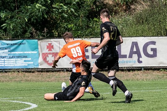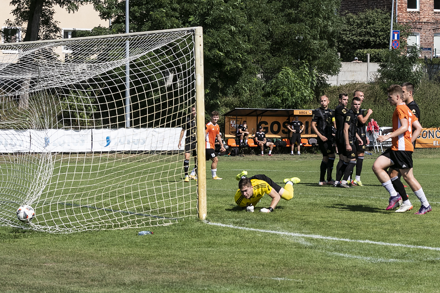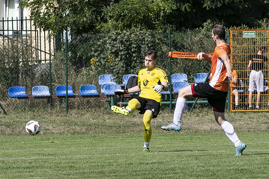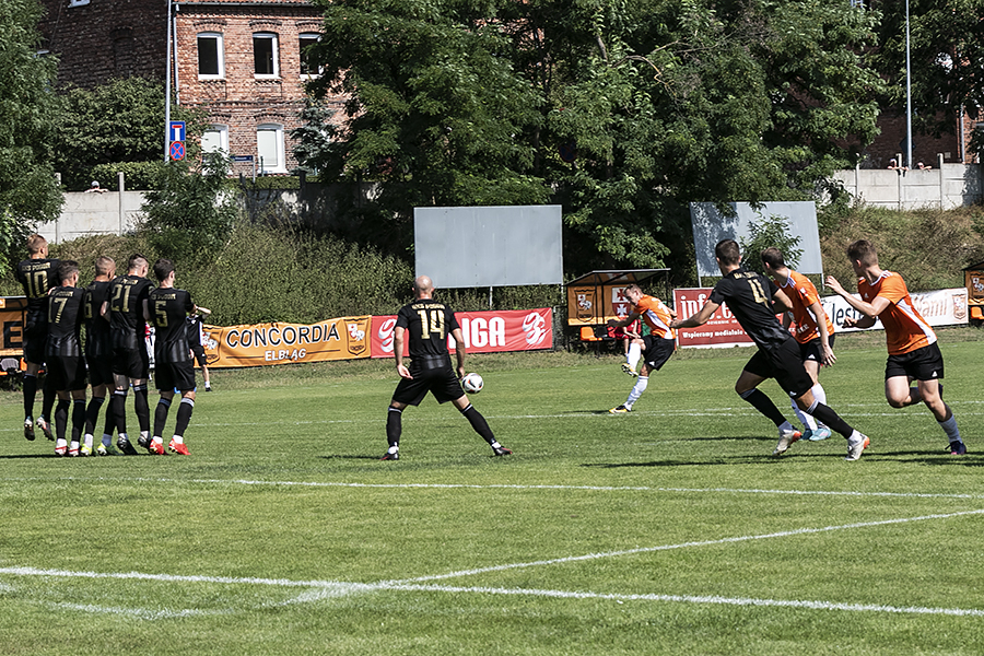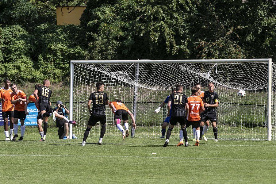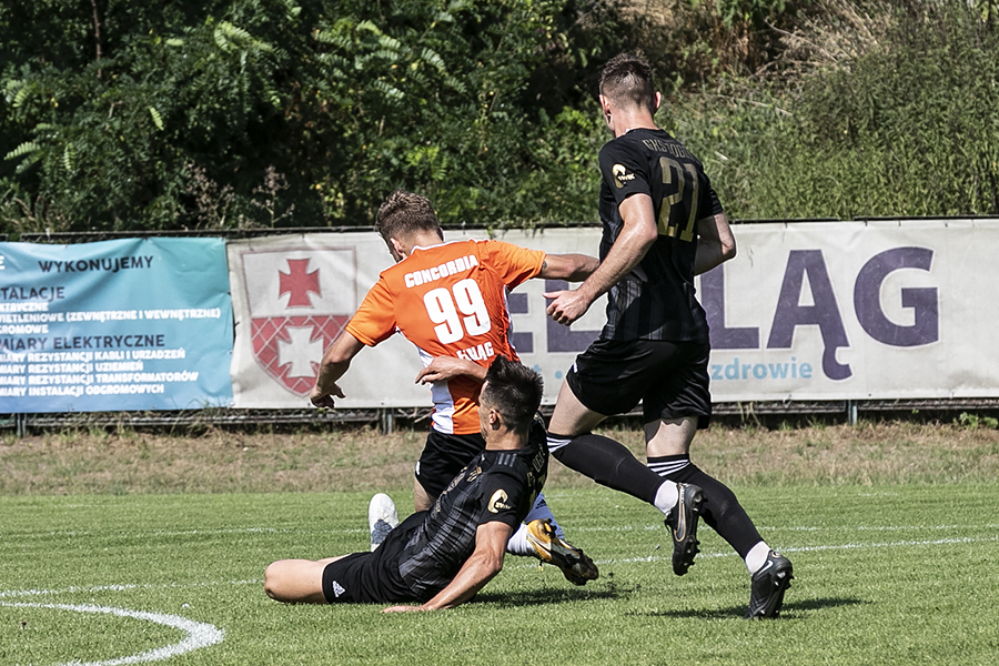 Concordia próbowała zrewanżować się gościom, ale ci ustawili szczelne zasieki i kontrolowali rywalizację. Jednak ich cały pomysł zmienił się w 25 minucie, gdy Eryk Jarzębski wybiegał w sytuacji sam na sam z bramkarzem i nieprzepisowo powstrzymywał go Kacper Szczudliński. Faul i czerwona kartka. Futbolówkę przed polem karnym postawił Łukasz Kopka i technicznym strzałem zmieścił ją przy słupku.