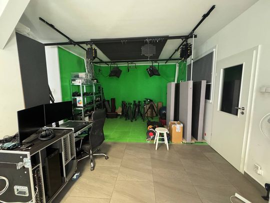 - Profesjonalne Studio Green Screen (ok. 19,4 m²): W pełni wyposażone studio nagraniowe z konstrukcją oświetleniową i zielonym tłem (green screen). Oddzielone szklaną ścianą, stanowi gotowe narzędzie do produkcji wideo, streamingu, sesji zdjęciowych czy webinarów.