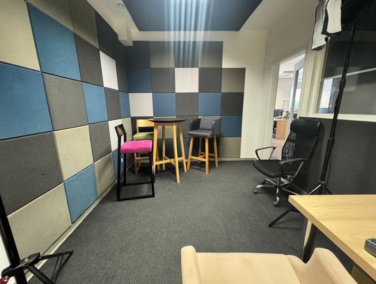 - Studio Lektorskie / Sala Podcastowa: Dodatkowe, wyciszone pomieszczenie z profesjonalnymi panelami akustycznymi na ścianach i wykładziną. Idealne do nagrań dźwiękowych, podcastów lub jako cicha sala do spotkań w mniejszym gronie.