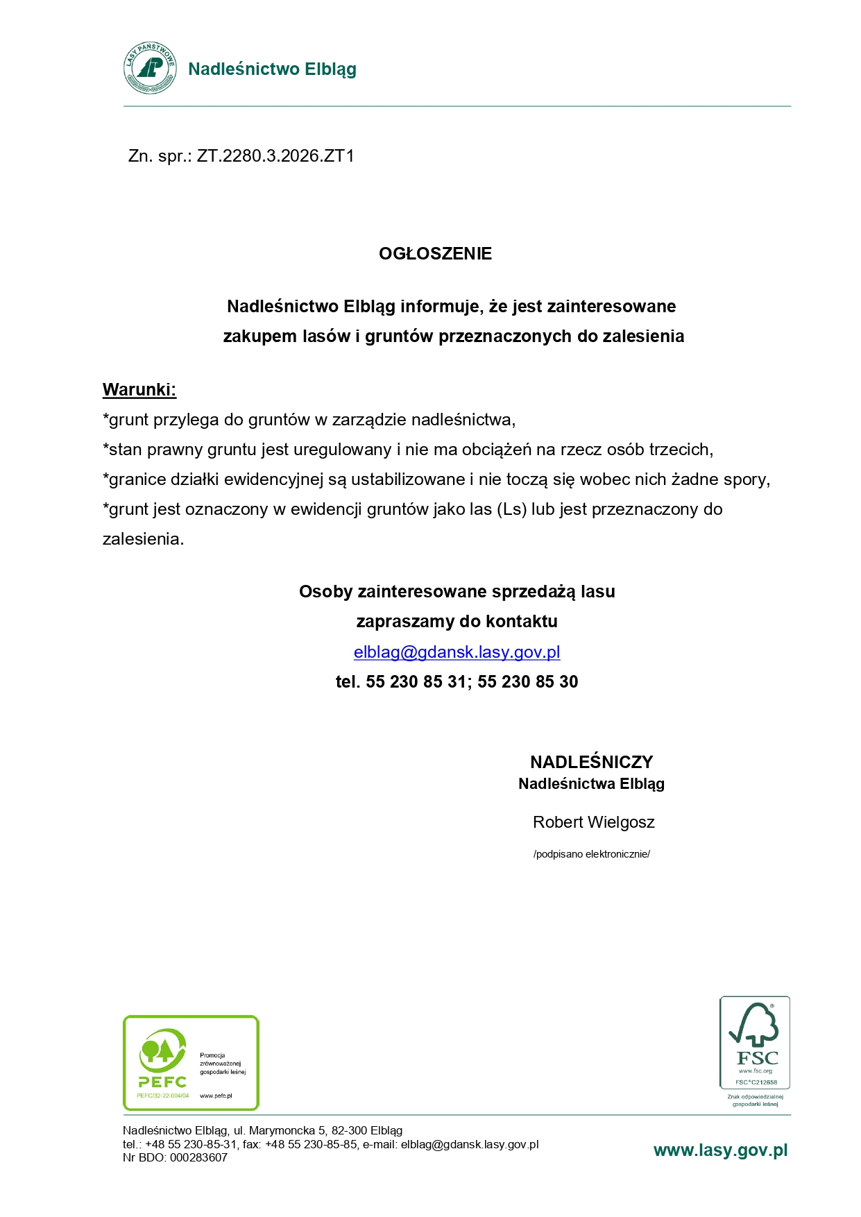 Nadleśnictwo Elbląg informuje, że jest zainteresowane